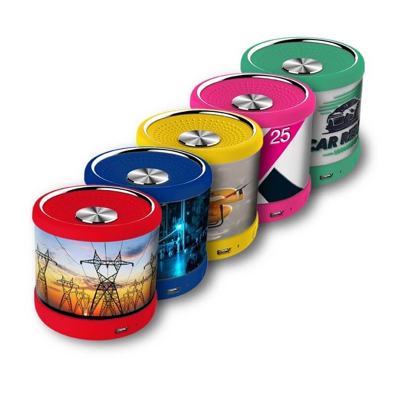 Využijte funkci TWS naplno se setem 2 kusů Bluetooth reproduktorů a zažijte poslech hudby v opravdové stereo kvalitě. V rámci setu získáte ideální techniku pro poslech skutečné stereo hudby, protože díky funkci TWS se oba reproduktory spojí a budou hrát synchronizovaně do dvou kanálů, aby zvuk zněl opravdu stereo. Tvar skladného válečku, standardně dodávaný v praktické uzavíratelné krabičce, je navíc vhodný i pro cestování. Připojení k mobilnímu zařízení probíhá s pomocí technologie Bluetooth 4.0 s dosahem až do 10 metrů. Reproduktory vám vyrobíme zcela ve vlastních Pantone barvách a lze je doplnit barevným CMYK potiskem dle vlastního přání, včetně reliéfního loga.