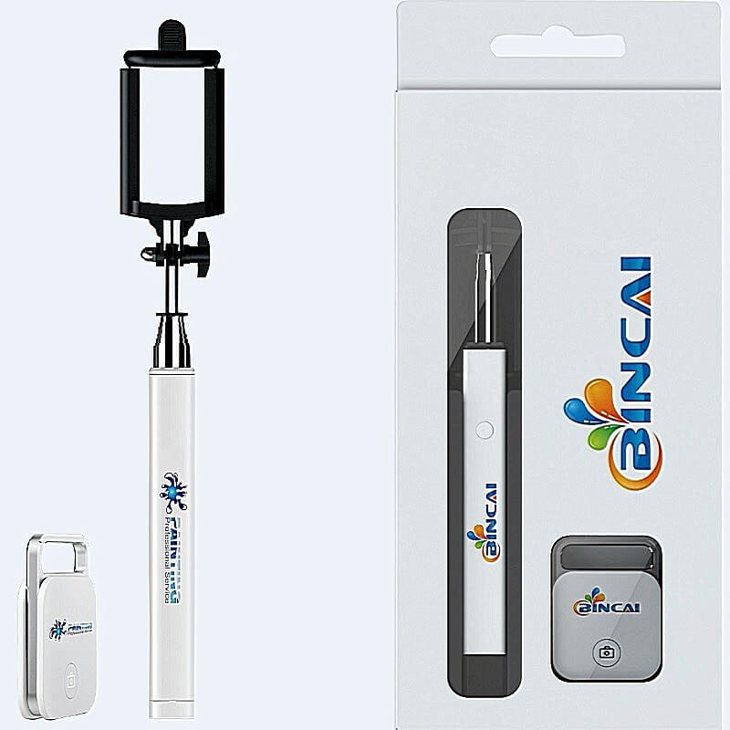 SELFIE SET - Univerzální Bluetooth spoušť pro mobilní telefony + selfie tyčka, dárková krabička. Na vzdálenost až 10 m můžete ovládat spoušť ve Vašem Smartphonu, nebo iPhonu a dělat tak fotky v pozicích, které Vám mobil v ruce nikdy nedovolí. BT spoušť je možné nosit jako přívěsek na klíče a kdykoliv okamžitě použít. Dlouhá výdrž baterie (cca 6 měsíců při použití 10x denně). Baleno v dárkové krabičce spolu se selfie tyčkou. Možnost CMYK celoplošného potisku.