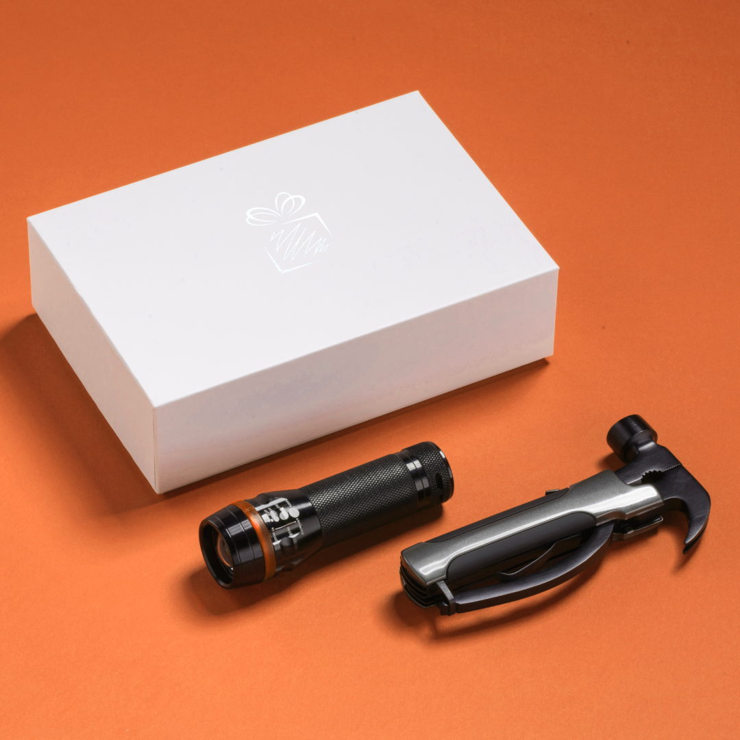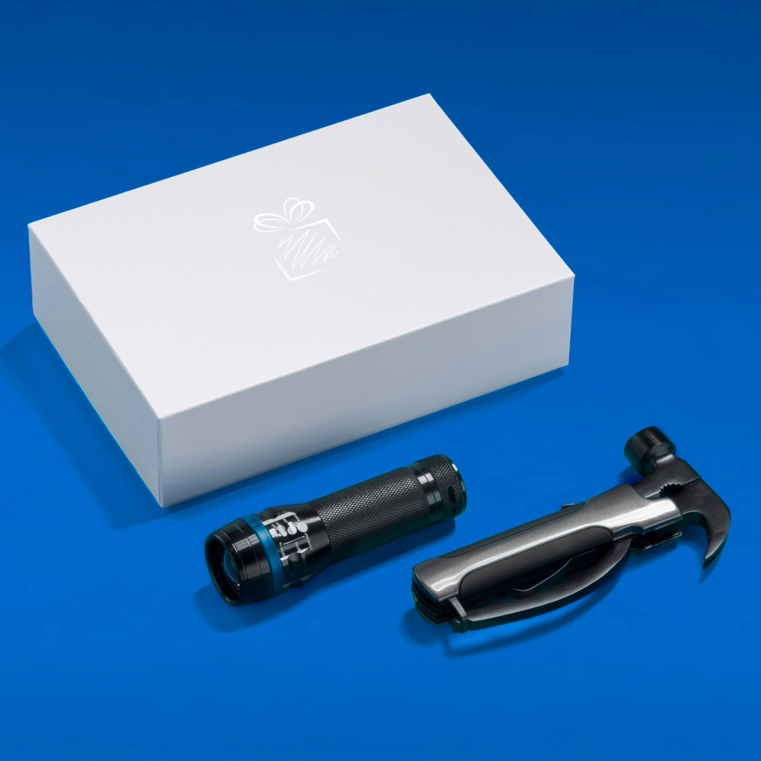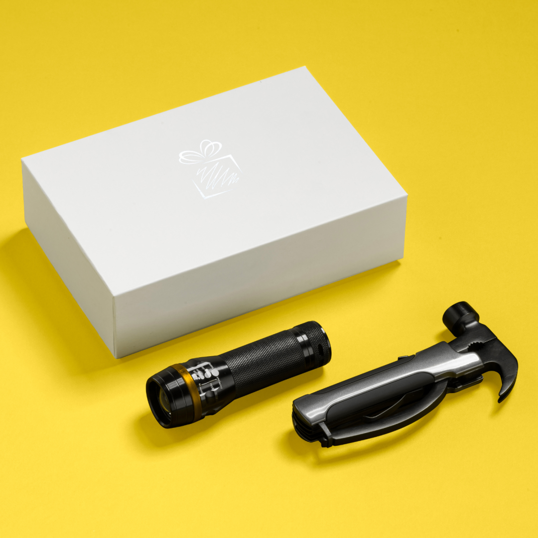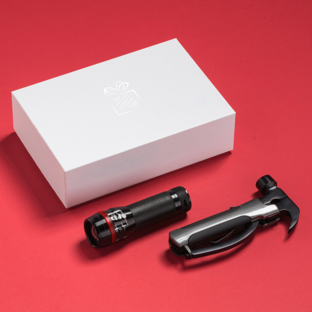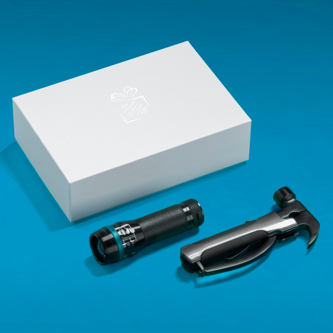Multifunkční sada pro přežití ideální pro outdoorové aktivity. Nástroj s 8 funkcemi z nerezové oceli. Má mimo jiné kladivo, které se v multifunkčních nástrojích nachází jen zřídka, a stahovák na nehty. LED svítilna Colorado vyrobená z vysoce kvalitního hliníku. Vytváří zaostřený světelný paprsek a zoom až 5 metrů. Generuje výstražné světlo (stroboskop). Speciální konstrukce umožňuje rozbití skla v případě nouze. 3 x AAA baterie součástí balení. Sada je zabalena v elegantní bílé krabičce. 9 barev baterky podle vašeho výběru.
