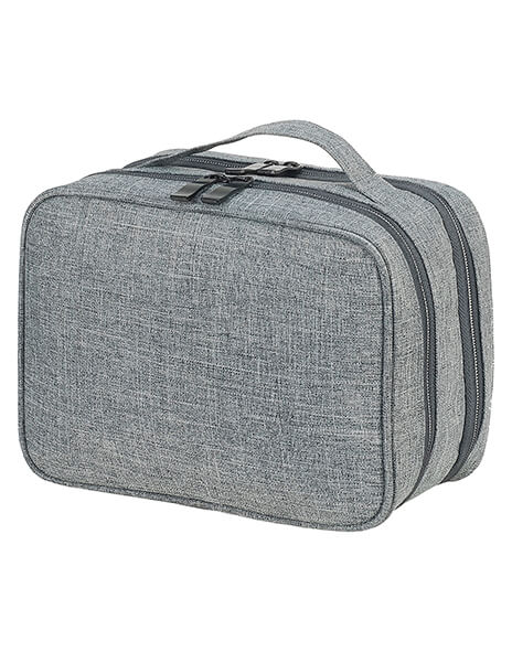 · 100% polyester (600D, melanž) · Praktická toaletní taška · Rukojeť · Hlavní přihrádka se zipem uvnitř sáčku · Druhá hlavní přihrádka s gumičkou na příslušenství · Kapacita: 5 litrů · Rozměry: 25 x 12 x 19 cm · Vhodné pro přenos, sítotisk a StickMax. Max. Plocha tisku: 17 x 12 cm.