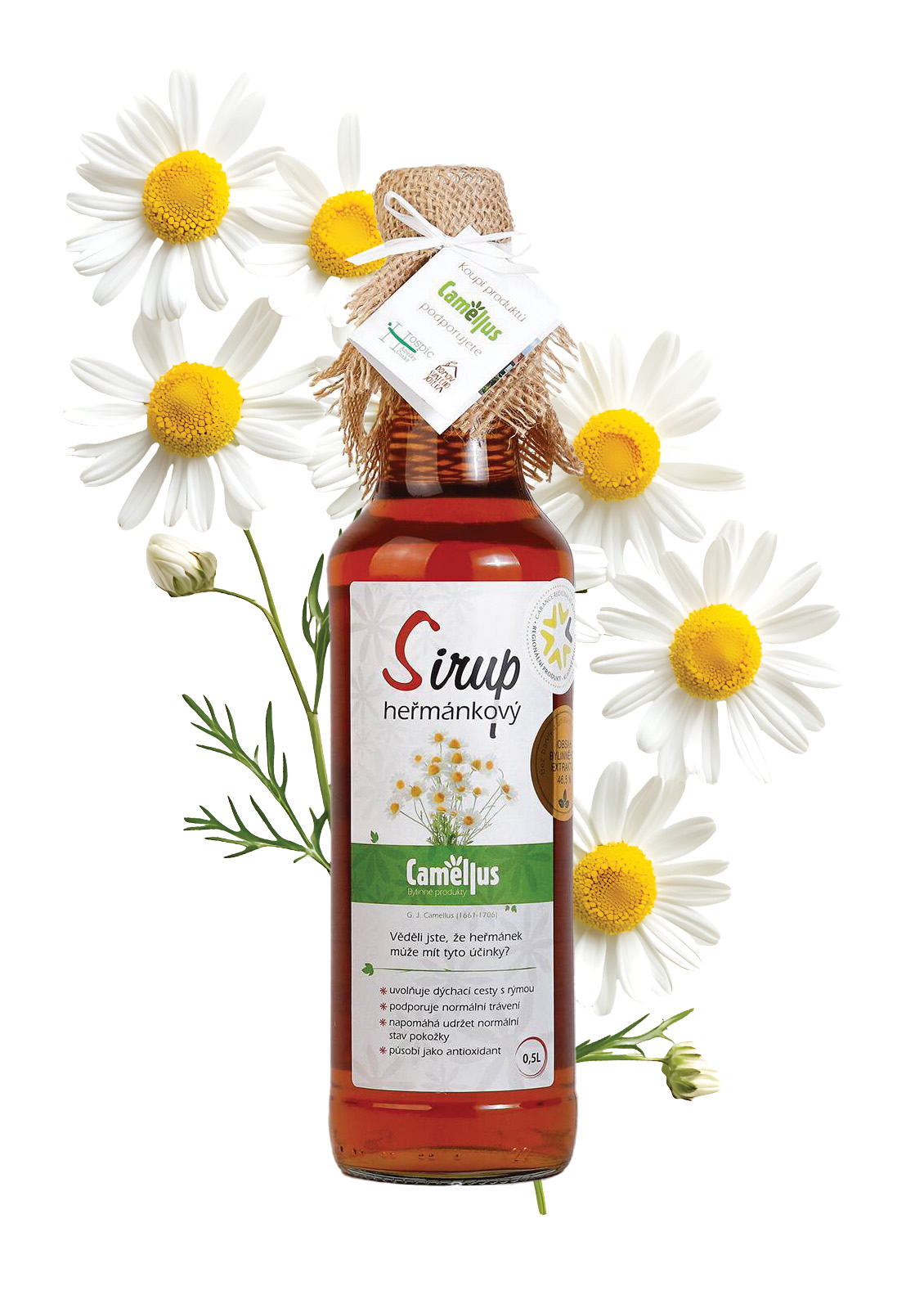 Bylinný sirup s 46,5% extraktu ze sušených květů heřmánku pravého, slazený cukrem, bez konzervantů a umělých barviv. Vhodný pro přípravu horkých i studených nápojů – ředí se v poměru 1:8 s vodou. Před použitím protřepat. Přírodní zákal nebo usazenina nemají vliv na kvalitu. Objem: 500 ml