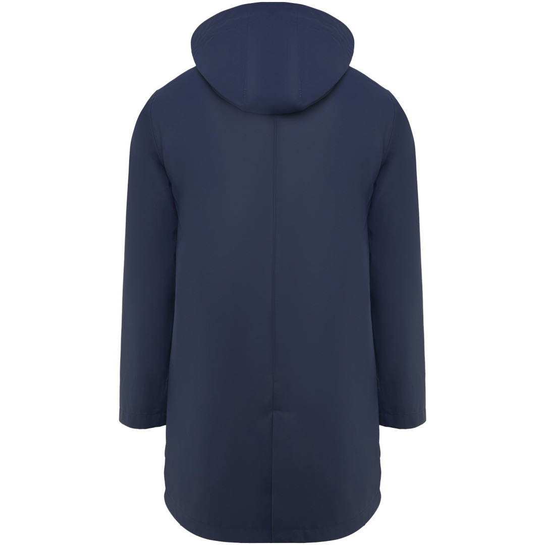 Nepromokavá pláštěnka. Kapuce s kšiltem. Zateplené zipy a švy. Kontrastní detaily v černé barvě. Dvě boční kapsy na zip. Rozparky na zadním lemu. Odnímatelný štítek. Nepromokavá. Modelka měří 185 cm a má na sobě velikost M.