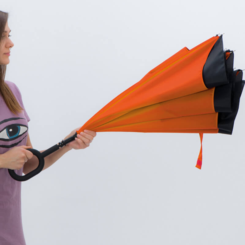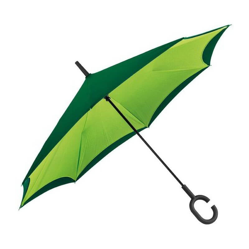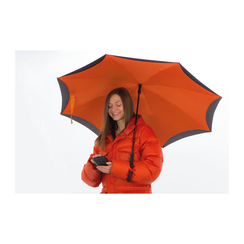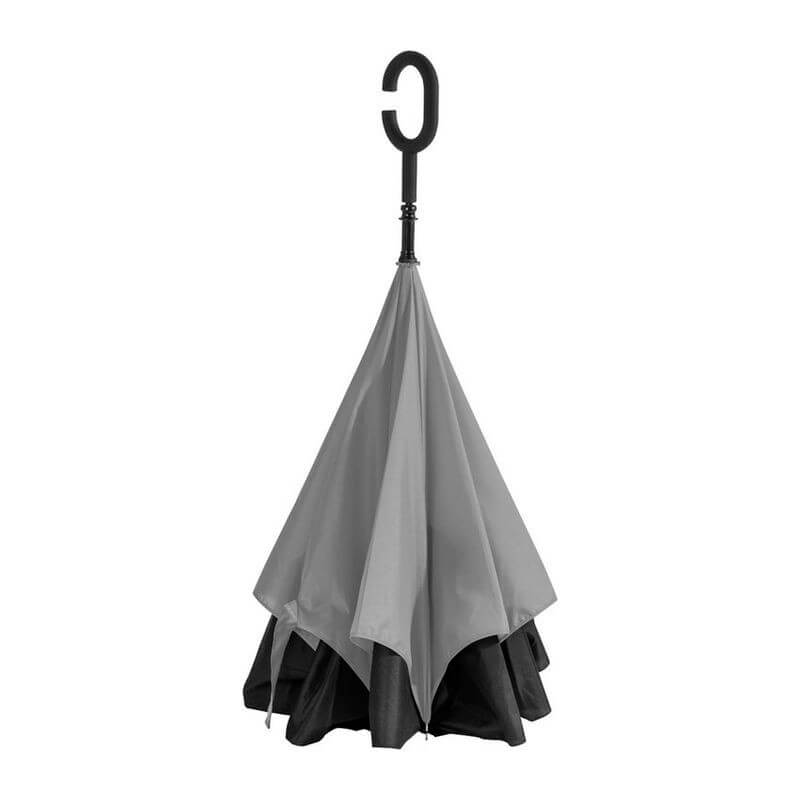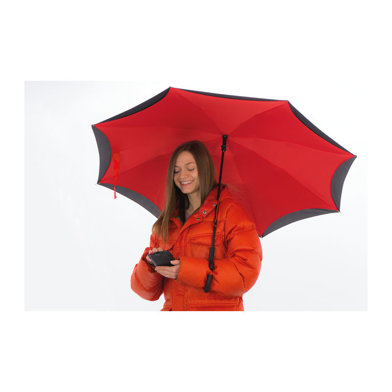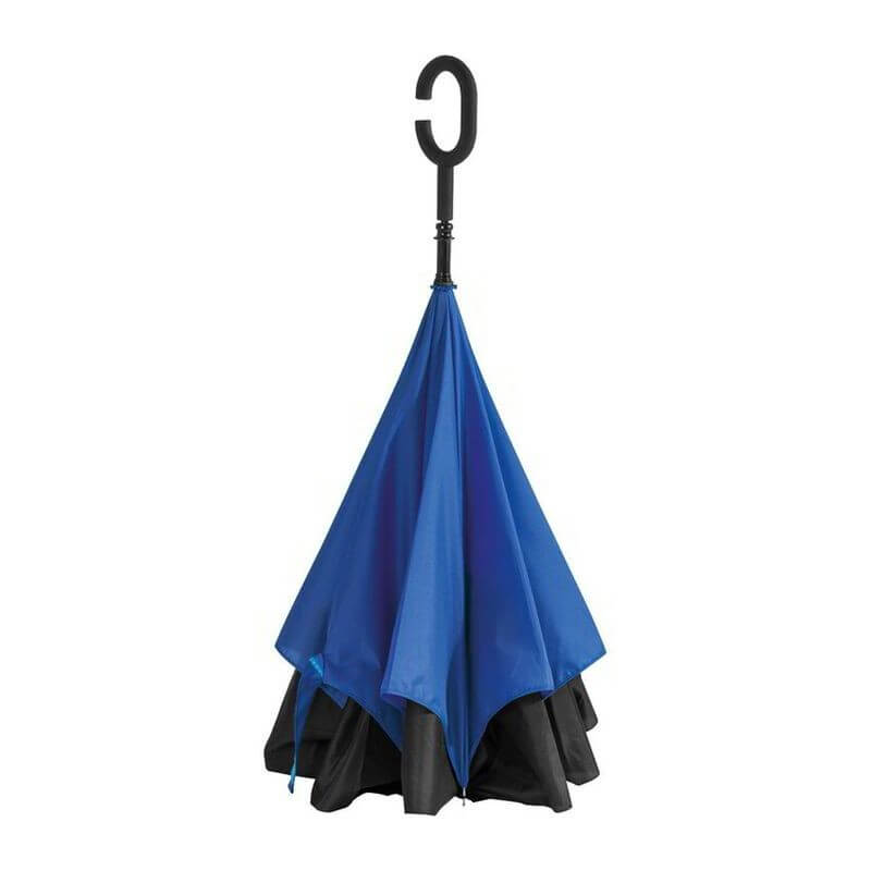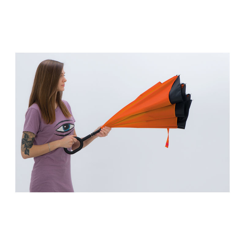 REVERSE opačně fungující skládací deštník z materiálu 190T pongee s C rukojetí pro snadné uchycení na zápěstí. Díky tomuto řešení můžete mít vždy volné obě ruce. Jako potisk doporučujeme sítotisk.
