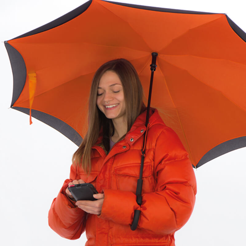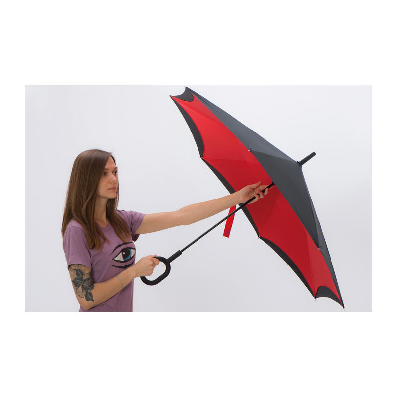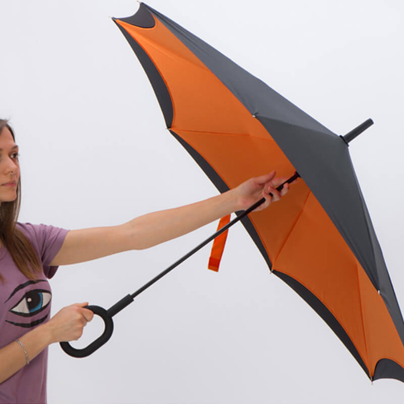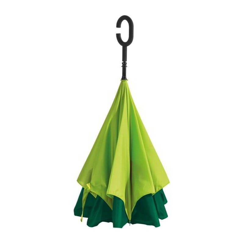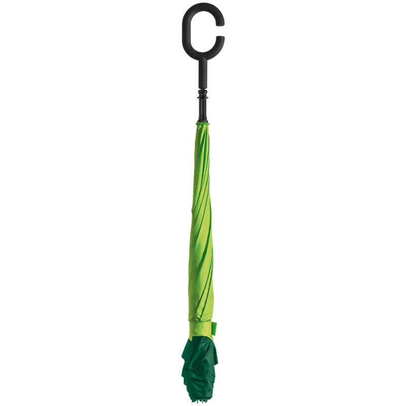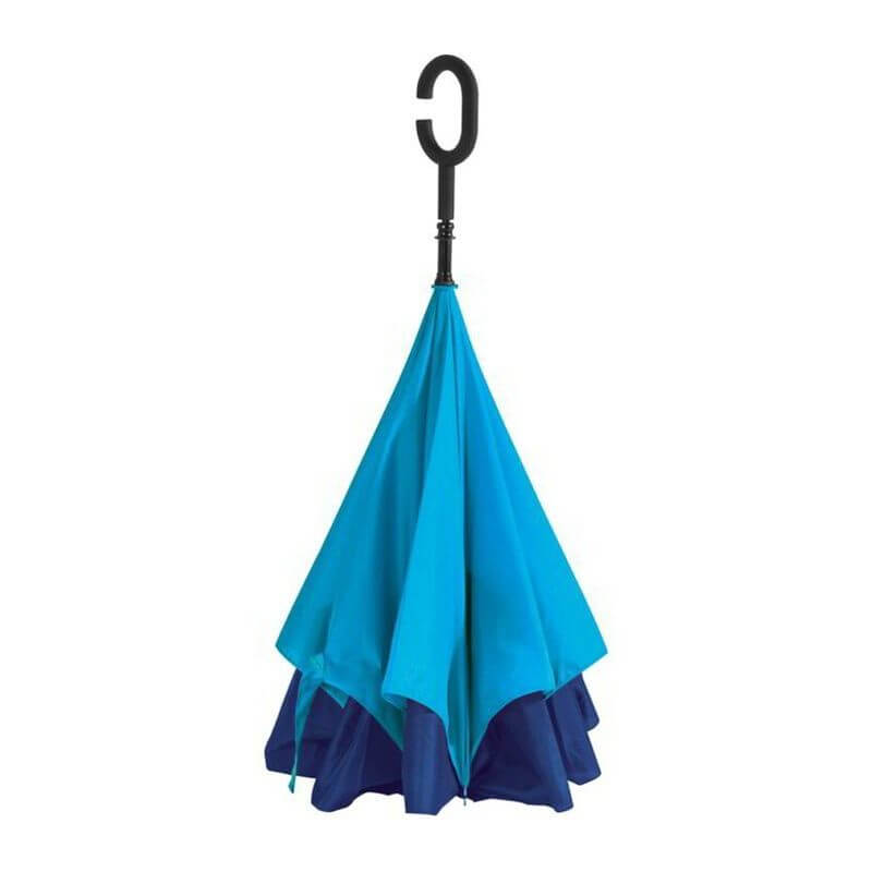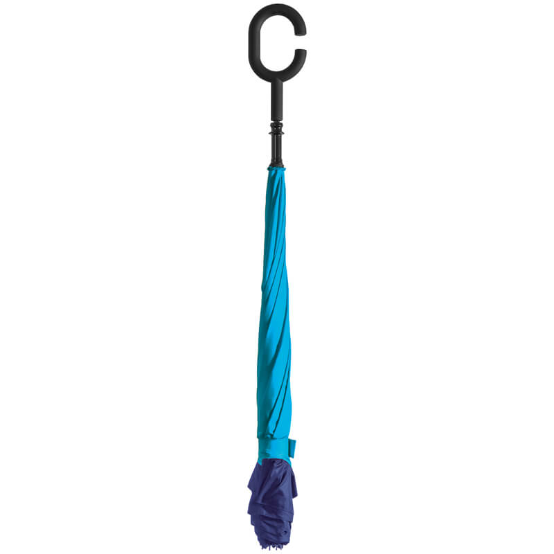 REVERSE opačně fungující skládací deštník z materiálu 190T pongee s C rukojetí pro snadné uchycení na zápěstí. Díky tomuto řešení můžete mít vždy volné obě ruce. Jako potisk doporučujeme sítotisk.