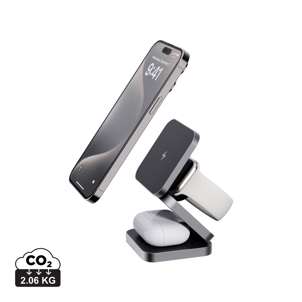 "Skládací bezdrátová nabíječka 3 v 1. Magnetická 15 W část pro větší zařízení, 5 W část pro menší zařízení (např. sluchátka), 2,5 W část pro chytré hodinky (pouze Apple Watch). Vyrobeno z RCS recyklovaného ABS a hliníku. Celkový podíl recyklátu dle váhy produktu: 38% RCS certifikace zajišťuje garanci použití recyklovaného materiálu díky transparentnímu přehledu nad dodavatelským řetězcem Včetně 120cm USB C kabelu z RCS recyklovaného TPE. Výstup: velká část: 9V/1.1A; 9V/1.67A (15W), střední část: 5V/1A (5W), část na hodinky: 5V/0.5A (2.5W).