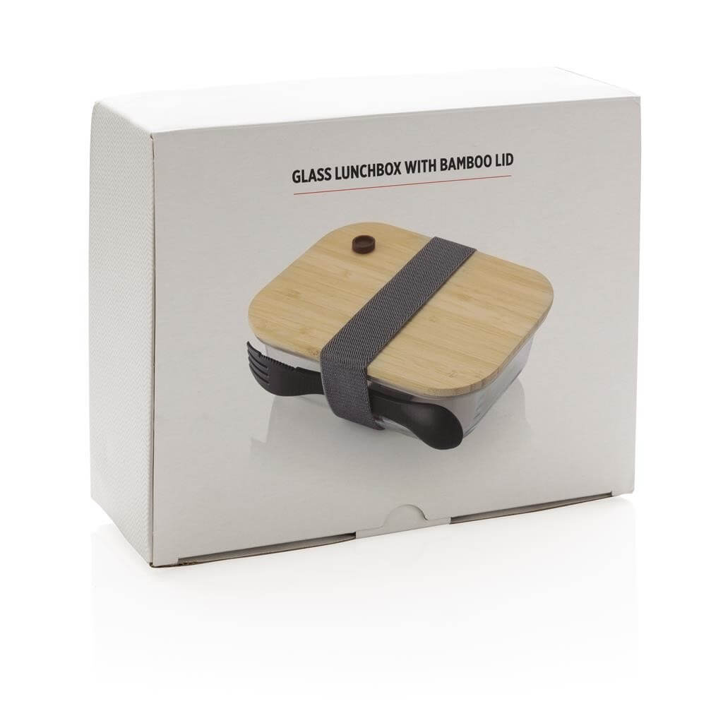 Skleněná krabička pro bezpečné uchování a ohřev pokrmů. Vzduchotěsné víko vyrobené z bambusu. Tělo krabičky vyrobené z borosilikátového skla odolného tepelným šokům. Včetně praktické lžičky/vidličky 2 v 1.