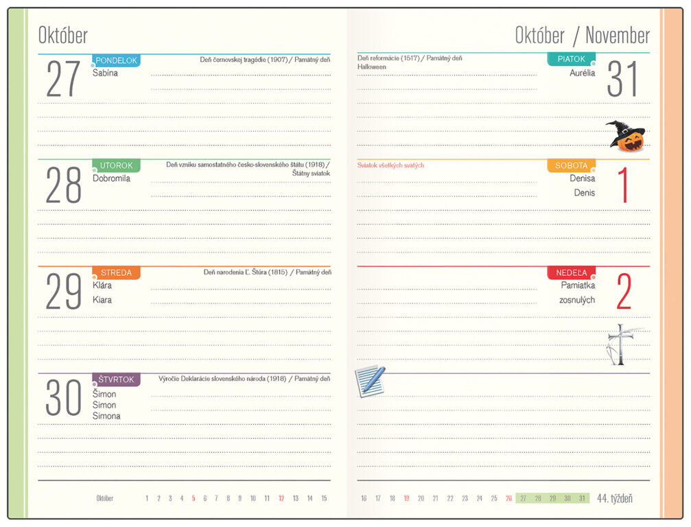 Kromě slovenského týdenního kalendáře obsahuje také termíny školních prázdnin a užitečné informace do školy - matematika, chemie, fyzika, slovenský jazyk, anglický jazyk.