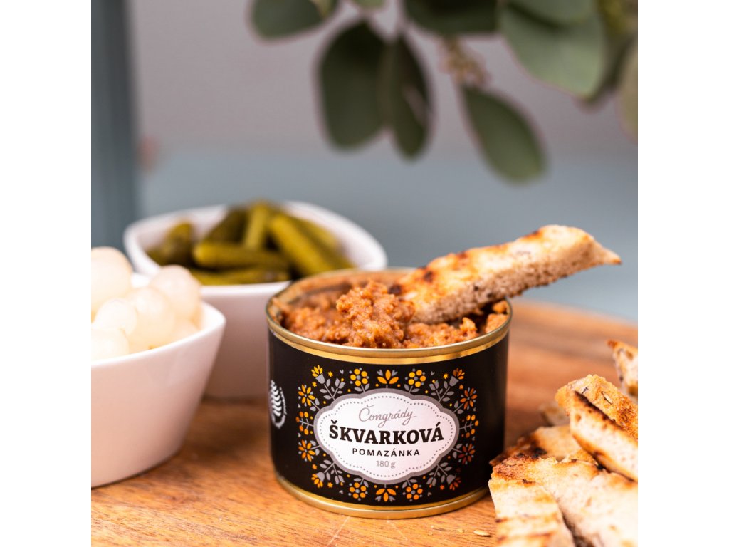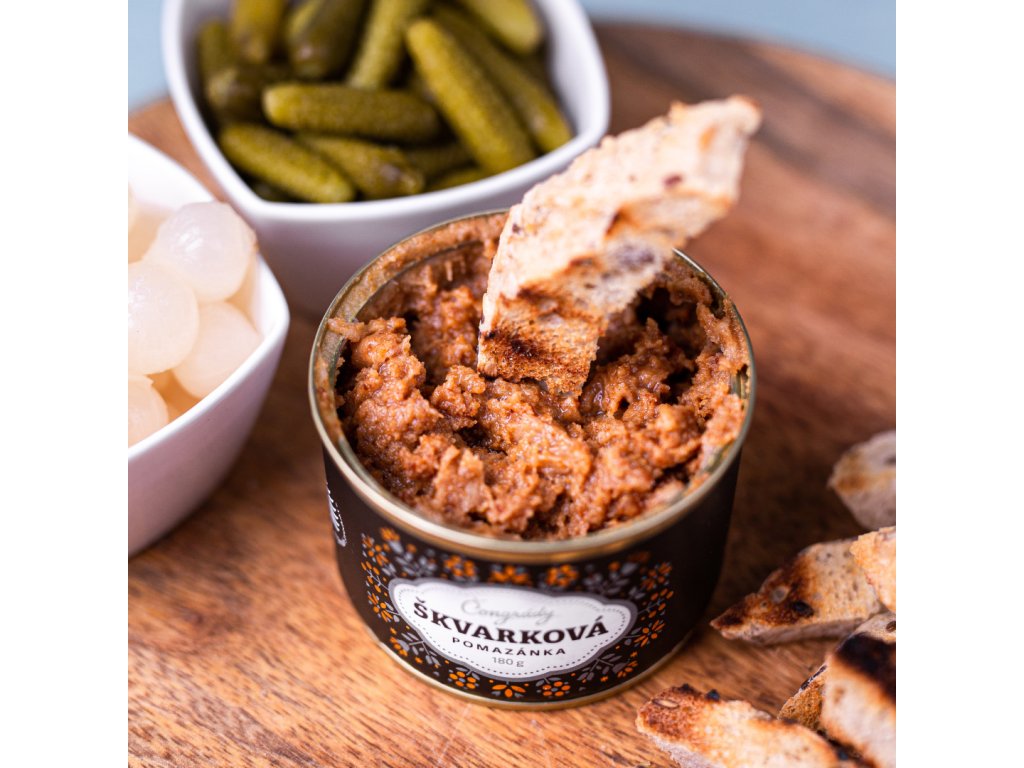 Poctivá škvarková pomazánka podle rodinné receptury. Tradiční vepřové škvarky, jemné vepřové sádlo a špetka cibule, kapie a hořčice vytvářejí nezapomenutelnou chuť, která se hodí na každý chléb, bagetu či jako rychlá svačinka na výlet. Bez lepku, konzervantů a umělých přísad, ideální i pro celiatiky. Složení: Vepřové škvarky (min. 60 %), vepřové sádlo, hořčice (pitná voda, hořčičné semínko, ocet, cukr, sůl, pepř), kapie, čerstvá cibule, česnek, jedlá sůl, mletý pepř. Váha: 180 g