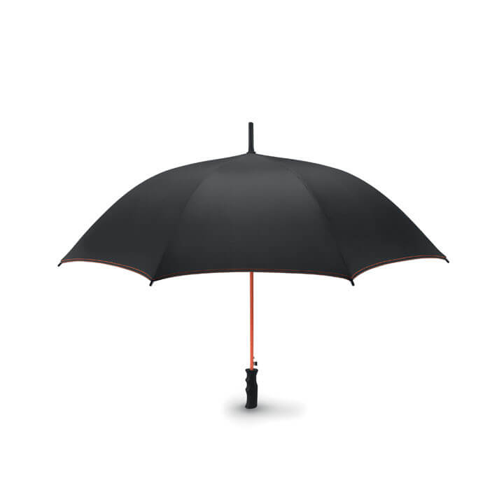 Luxusní automatický deštník ze 190T materiálu, černá kovová konstrukce. Černé ABS pogumované držadlo. 2 skldádací sekce. Ladící pouzdro.