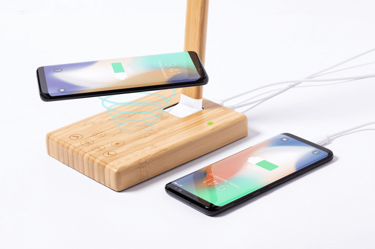Bambusová multifunkční stolní lampa s 25 LED, nastavitelným jasem a 1/2 hodinovým časovačem. S vestavěnou bezdrátovou rychlonabíječkou (10W) a portem USB pro nabíjení 2 zařízení současně (1 bezdrátově a 1 přes kabel). Včetně USB nabíjecího kabelu.