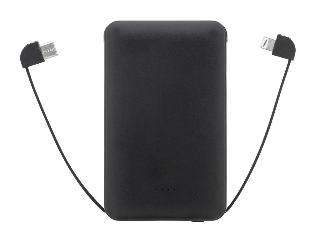 Power banka z recyklovaného ABS plastu s baterií 5 000 mAh a integrovanými nabíjecími kabely s konektory micro USB, USB-C a Lightning. S nabíjecím portem USB a vstupním portem USB-C. Včetně nabíjecího kabelu USB. Kapacita baterie: 5000 mAh. USB kabel je součástí balení: Ano