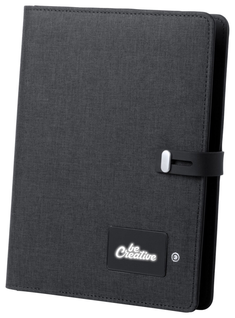 Sloha na dokumenty A5, 300D polyester s 4000 mAh power bankou, vestavěnou bezdrátovou nabíječkou, 64 listým linkovaným blokem a LED světlem pro osvícení plíšku s vygravírovaným logem. S USB nabíjecím...