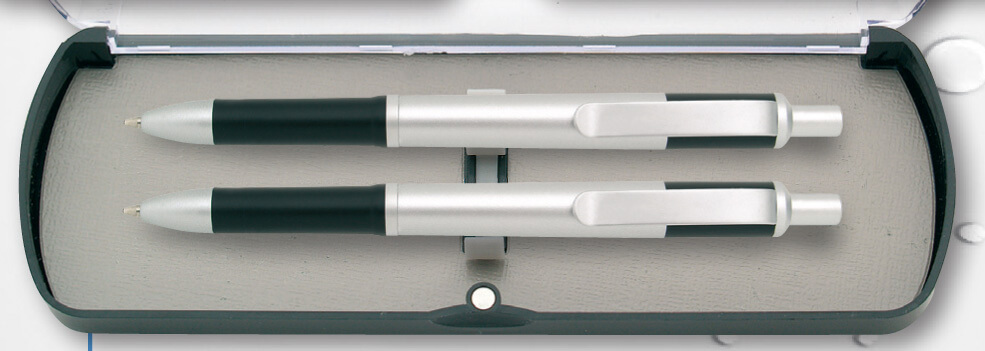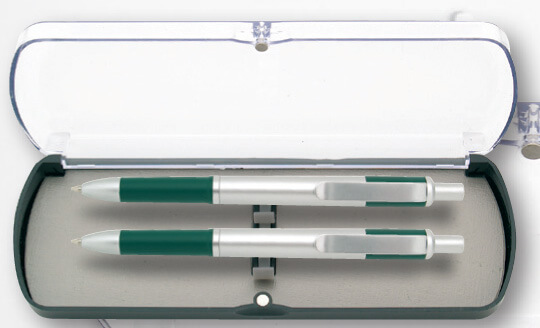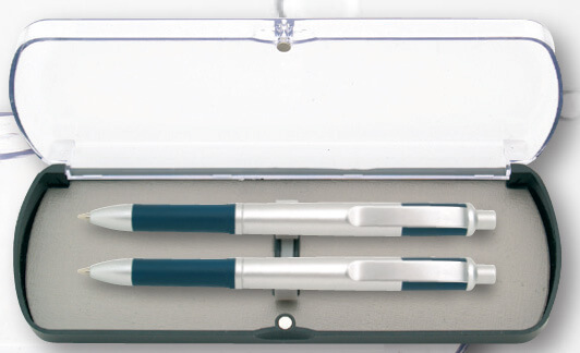 Dárková sada - plastová. Kuličkové pero 0,5 mm + mechanická tužka 0,5 mm v plastové krabičce s průhledným vrchem. V černé, modré a zelené barvě