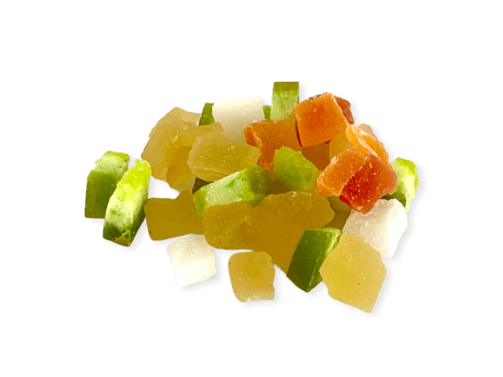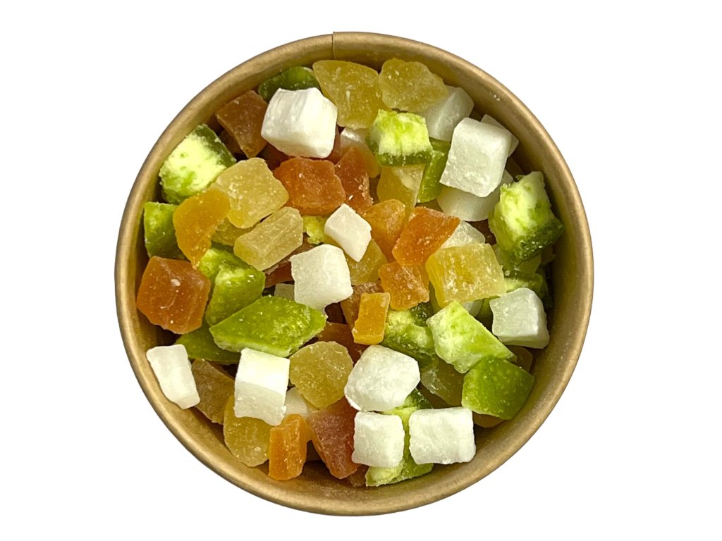 Směs sušeného ovoce a kokosu v kostkách. Ideální na svačinku, pečení nebo do dalších mixů. Tato barevná ovocno - kokosová směs obsahuje pomelo kostky, kokos kostky, papaya kostky a ananas kostky.