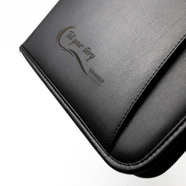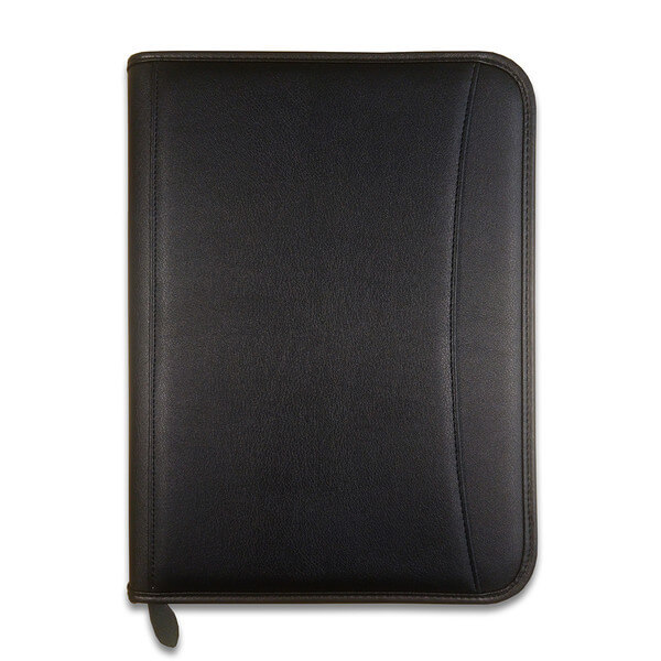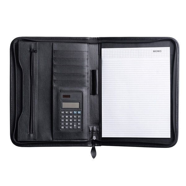 Černá konferenční složka A4 s kalkulačkou, papírovou vložkou A4, vyrobená z ekokůže se zapínáním na zip. Má až 6 kapes, zámky na dokumenty, držák na pero a kapsu na zip. Kalkulačka napájená 1 baterií AG10 dodávanou s výrobkem.