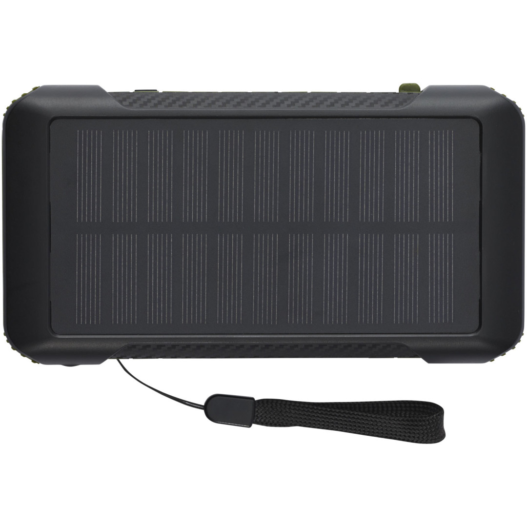 Solární powerbanka Soldy z recyklovaného RCS plastu o kapacitě 10 000 mAh je ideálním společníkem pro nabíjení při outdoorových aktivitách. Je vybavena ručním klikovým dynamem pro ruční generování energie pro případ, že vám dojde baterie a nesvítí slunce. Powerbanku lze nabíjet také přes USB-C nebo micro USB port na zařízení. Díky vestavěným nabíjecím kabelům s konektory USB-C, iOS, USB-A a micro USB vám tato powerbanka umožňuje nabíjet většinu chytrých telefonů, fotoaparátů, powerbank, sluchátek atd. Powerbanka má maximální výstupní výkon 2,4 A na port. Vstupní výkon je omezen na 2 A. Dodáváno s uživatelskou příručkou a 30cm nabíjecím kabelem USB-A na USB-C a zabaleno v krabičce ze 100% recyklovaného kraftového papíru.