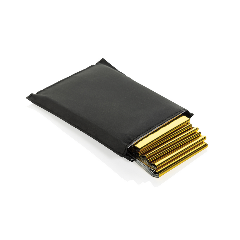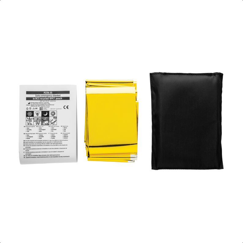 Nouzová fólie Solra poskytuje spolehlivou ochranu v exteriéru nebo v krizových situacích. Je lehká, kompaktní, znovu použitelná a nepromokavá. Vyrobená z odolné PET Mylar fólie (tloušťka 12 μm), stříbrná z jedné strany a zlatá z druhé, pro optimální zadržování tepla a odolnost vůči povětrnostním vlivům. Pouzdro z recyklovaného RPET 420D polyesteru má zapínání na suchý zip, aby byla fólie bezpečně uložena. Všechna povinná označení, včetně data spotřeby, CE, LOT čísla a výrobce, jsou uvedena v návodu dle EN ISO 15223-1:2021. Pouzdro z certifikovaného recyklovaného materiálu (RCS). RCS (Recycled Claim Standard) je standard pro ověření recyklovaného obsahu produktu v rámci celého dodavatelského řetězce. Celkový podíl recyklátu: 35 %. Bez PVC.