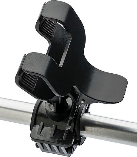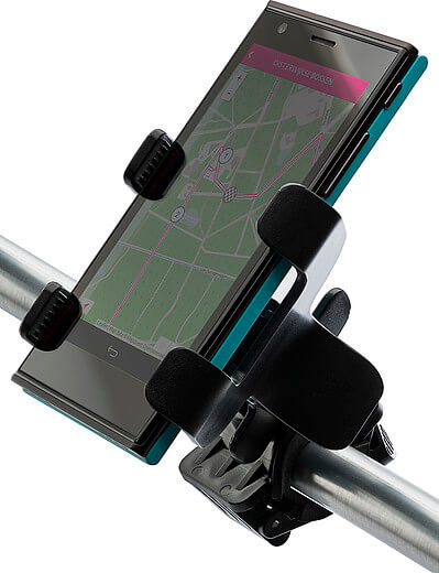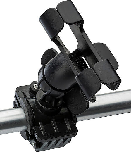 Plastový nastavitelný držák mobilního telefonu na kolo; držák pro držení mobilního telefonu lze pohybovat v několika polohách. Držák lze umístit na řídítka a nastavit tak, aby se vešly.