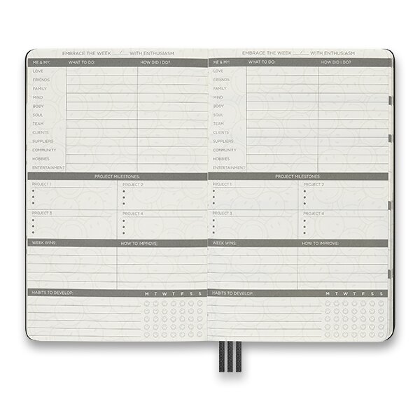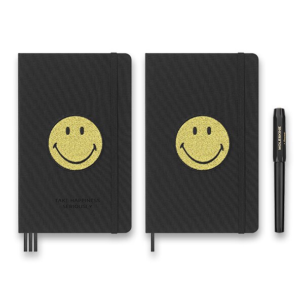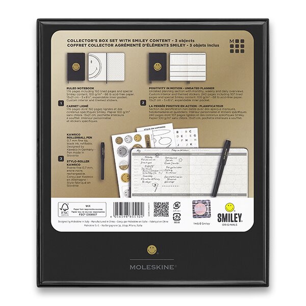 Souprava Moleskine SMILEY obsahuje černý nedatovaný diář velikosti L, zápisník velikosti L a černý roller Kaweco v dárkovém boxu. Limitovaná edice SMILEY je vydávána k 50letému výročí. SMILEY je průkopníkem tzv. SMILEY. pozitivní žurnalistiky s heslem Take the Time to Smile (Udělejte si čas na úsměv). Kreativita nás činí šťastnými a štěstí nás činí kreativními, takže zvedni pero nebo tužku a začni brát své štěstí vážně.
