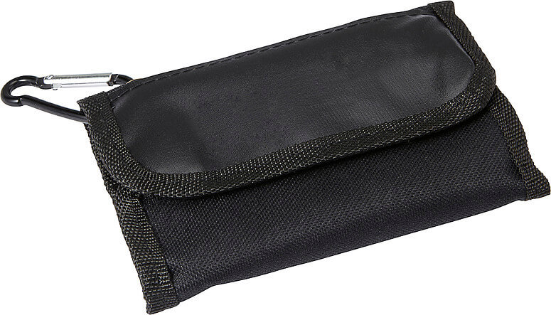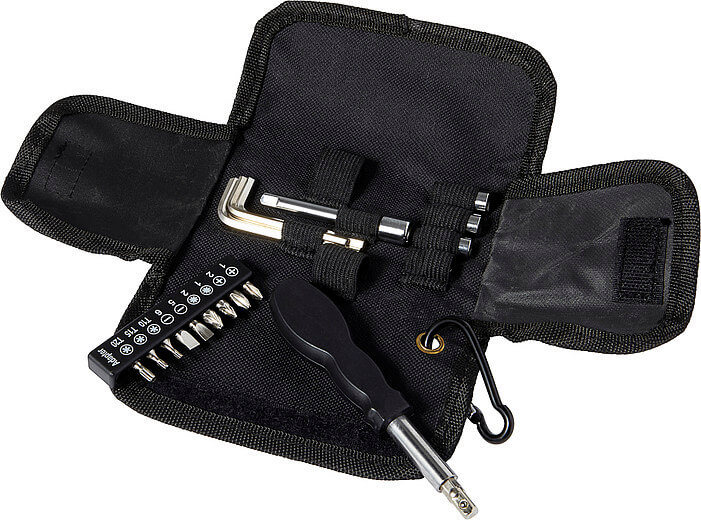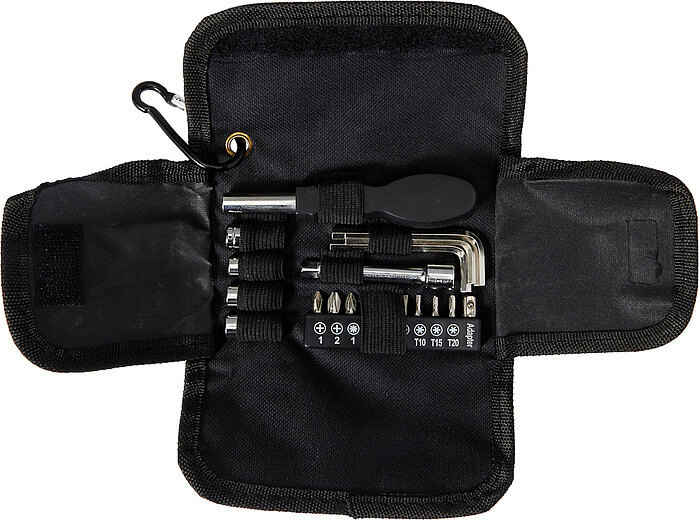 20dílná sada nástrojů z 600D oxfordského textilního pouzdra se suchým zipem a karabinou v černé a stříbrné barvě. Tato sada obsahuje: šroubovák, tři kusy šestihranných klíčů, čtyři kusy zásuvek, 10 kusů bitů, brašnu na nářadí a jednu prodlužovací lištu.