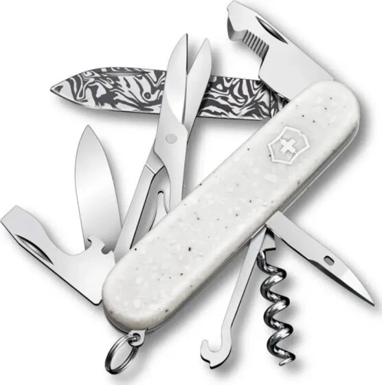 Special Companion Damast Limitovaná edice 2025 Naše v pořadí 16. limitovaná edice kapesního nože s čepelí z damaškové oceli, zhmotněná letos do modelu Special Companion dostupném v exkluzivním provedení s matnými bílými střenkami, je určena pro náročné sběratele. výjimečné kvalitativní zpracování. V počtu omezeném celosvětově na 7.000 kusů je tento model dostupný s čepelí sestávající z 264 vrstev oceli Damasteel® v unikátním vzoru pojmenovaném Svavner o tvrdosti 60 HRC. Povrchová úprava střenek Corian® se skládá ze směsi akrylové pryskyřice a přírodních minerálů, přičemž jednotlivé její šupinky nabývají vzhledu přírodního kamene, což dokonale ztělesňuje sofistikovanou eleganci. Damasteel® představuje práci řemeslníků, jejíž původ sahá více než tisíc let dozadu. Damašková ocel se vyrábí patentovanou metalurgickou metodou, která začíná atomizací oceli plynem, během které se roztavená ocel protlačuje přes trysku a aerosoluje. Prášky se vrství, utěsňují, zhutňují a spojují procesem zvaným izostatické lisování za tepla (HIP). Proces vrstvení následně předdefinuje vzor konečného produktu. Materiál se pak kuje, texturuje, válcuje a kroutí aby získal svůj jedinečný vzor, což je proces podobný tradiční technice. Vzor damaškové oceli se stane viditelným až po leptání povrchu, přičemž dva různé typy použité oceli (v různých vrstvách) reagují na oxidaci v důsledku jejich složení odlišně. Takto důmyslná kombinace jedinečné estetiky s pozoruhodnou kvalitou vytváří unikátní sběratelský kousek. Výsledkem spojení výjimečného designu a vysoce kvalitních materiálů je nůž ztělesňující sílu vynalézavosti spojenou se snahou o dokonalost. Kapesní nůž obsahuje: 1. Čepel, velká 2. Vývrtka 3. Otevírač na korunkové uzávěry 4. Šroubovák 6 mm 5. Odstraňovač izolace drátů 6. Děrovač / výstružník 7. Nůžky 8. Víceúčelový hák 9. Kroužek 1. Kroužek1. mm Balení: speciální dárkové balení.