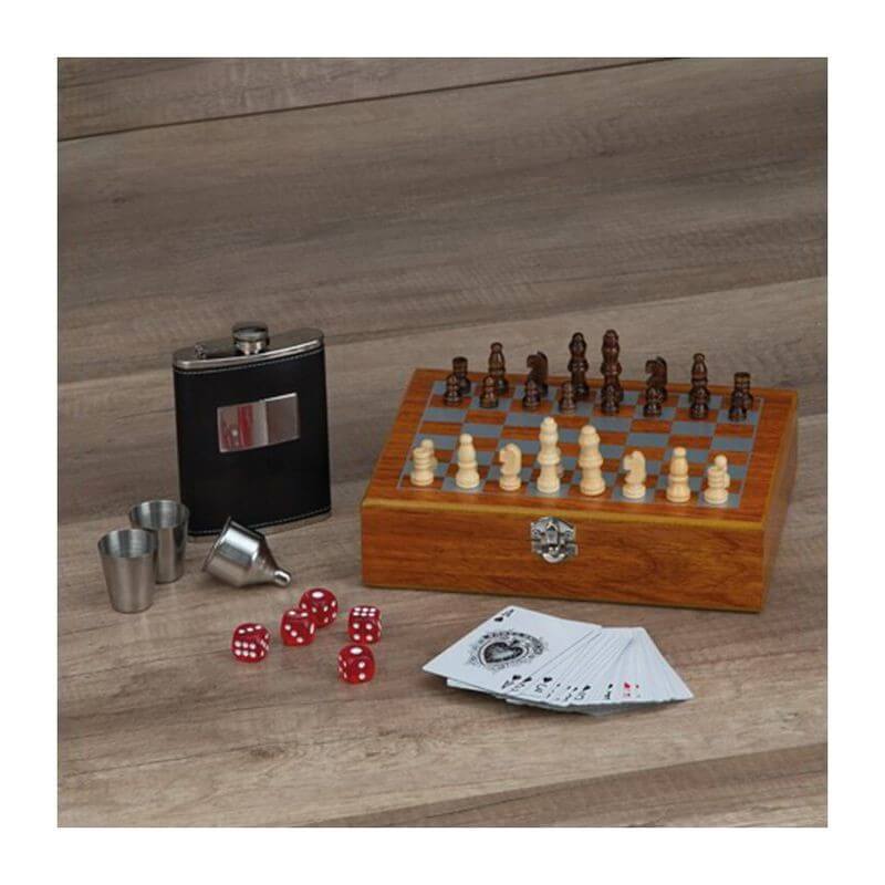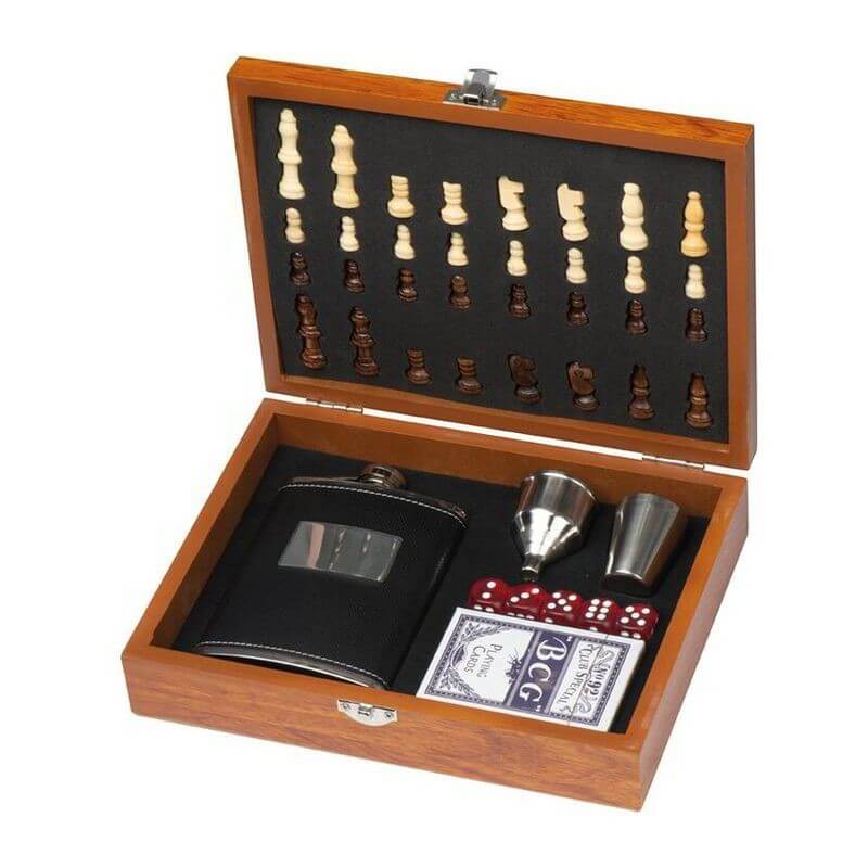Sada placatky (objem 237 ml) se 2 pohárky a nálevkou. Krásné dřevěné dárkové balení obsahuje i hrací kostky / 5ks /, malou šachovou sadu a hrací karty