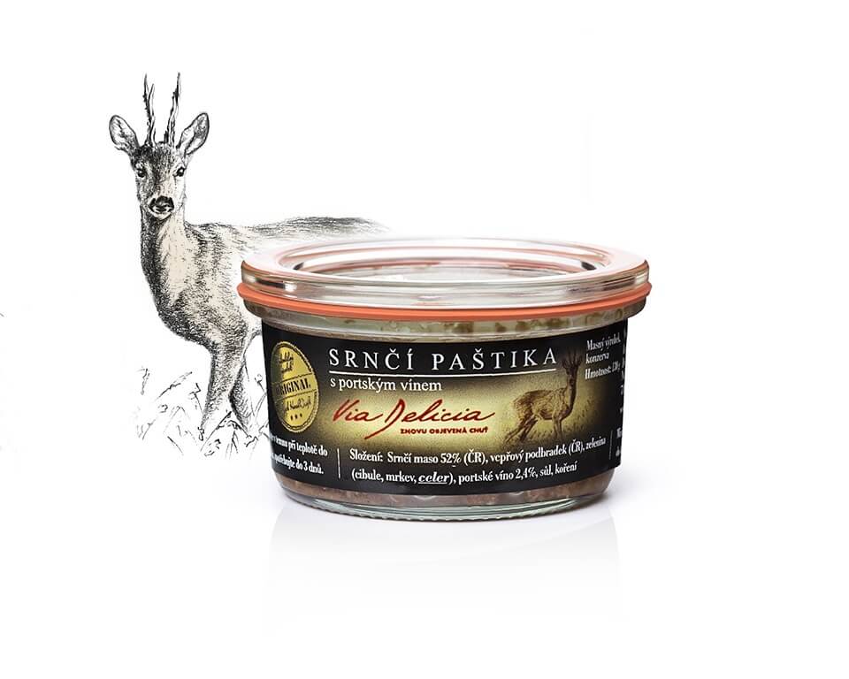 Srnčí paštika s portským vínem Via Delicia je inspirována starými recepturami, kde se kvalitní srnčí maso kombinuje se sladkým vínem. Hrubě mletá paštika z vyhledávaného srnčího a vepřového masa, cibulí, mrkví a celerem. Portské víno dodává paštice nezaměnitelnou chuť. Výborná na pečivo i na studenou mísu.