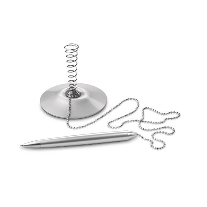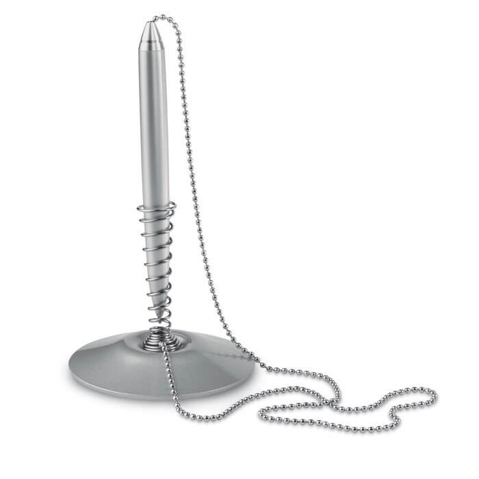 Plastové kuličkové pero s kovovým stojanem. Modrý inkoust.
