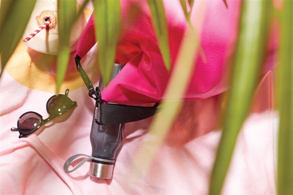 Láhev na vodu vyrobená z tritanového plastu bez obsahu BPA. Poutko na víku umožňuje snadné zavěšení na cvičební stroj a láhev je díky svému ideálnímu tvaru vhodná pro většinu držáků na nápoje. Láhev se snadno čistí. Je možné přidat potisk.