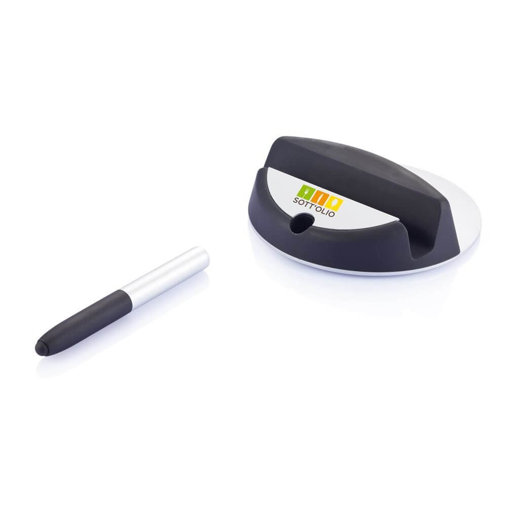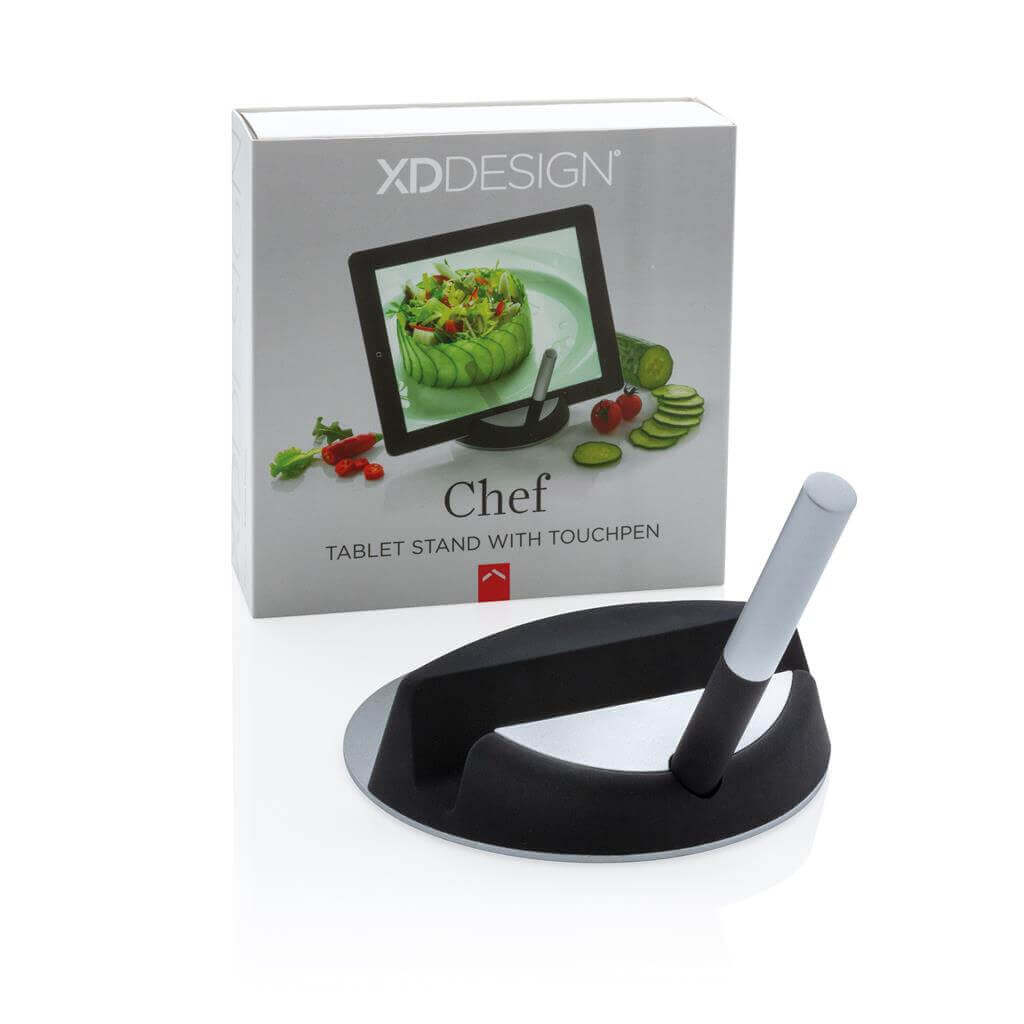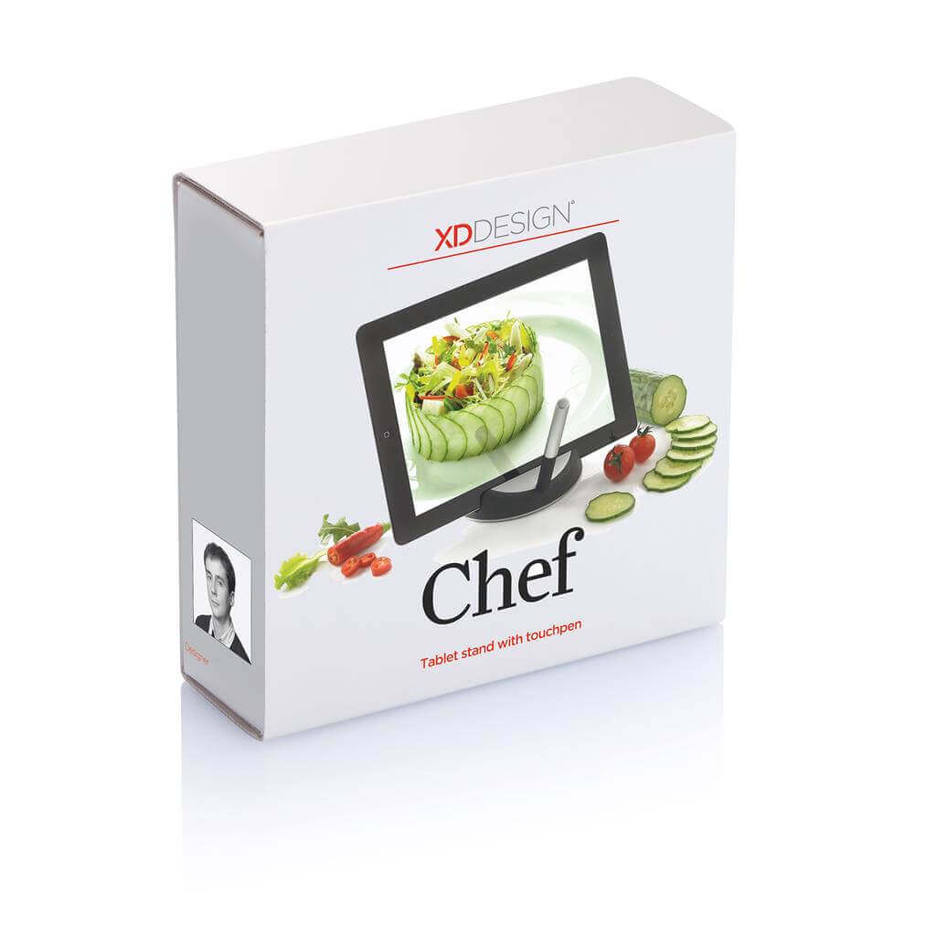 Chef je stojan na tablet pro všechny moderní a tvořivé šéfkuchaře. Bytelné dotykové pero usnadňuje použití tabletu v kuchyni plné páry, aniž by na tabletu zůstaly stopy po jídle. Ochranný vzor®.