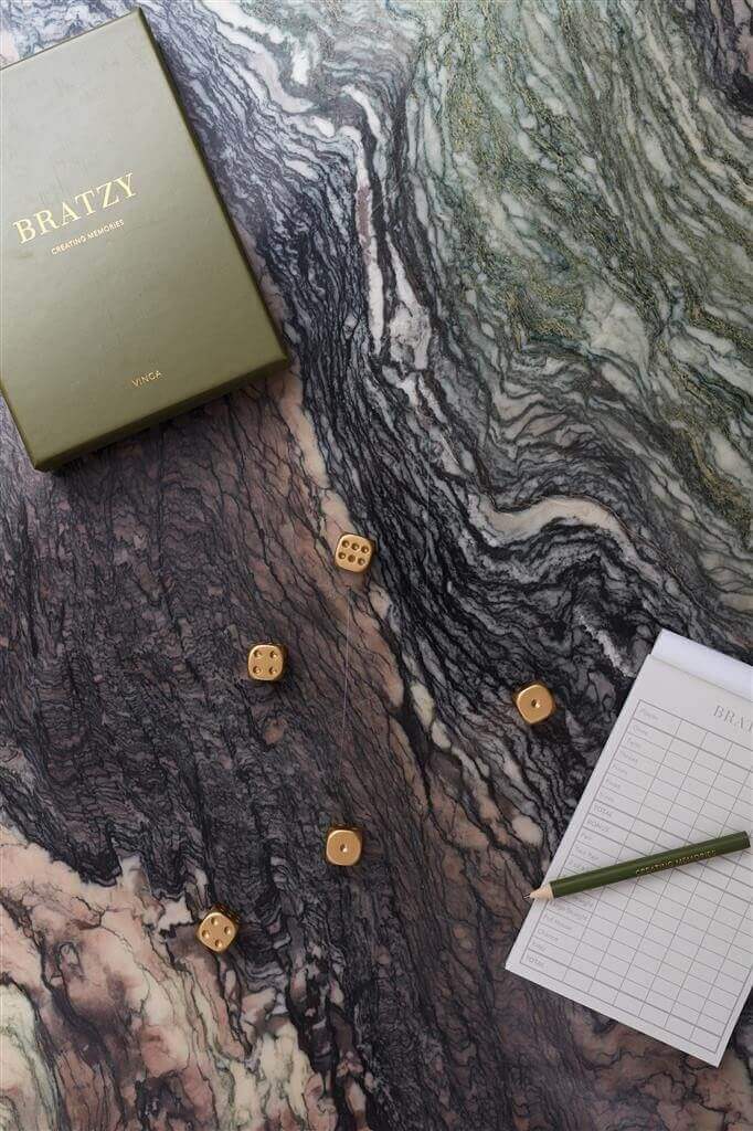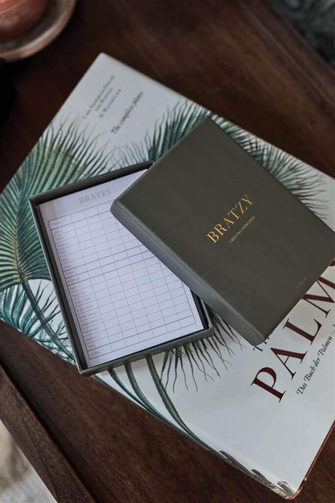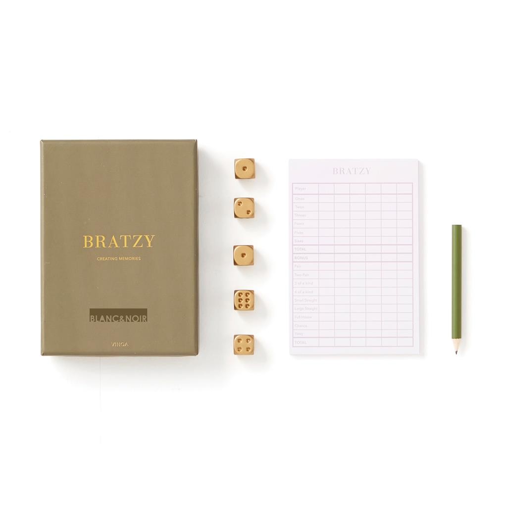 Yatzy v luxusním balení! Zlatými kostkami a stejně exkluzivní tužkou povyšujeme řadu Yatzy na Bratzy. Tato hra, která je dodávána ve stylové krabici se zlatým potiskem, je vhodná jako dárek, stejně jako pěkný detail na konferenční stolek.