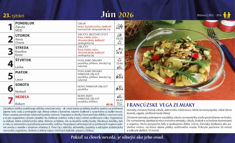 Stolní kalendář sestavený podle fází Měsíce je určen všem, kteří touží žít v souladu s přírodou a naslouchat svému tělu. Na každý týden nabízí praktické rady ovlivněné aktuální fází Měsíce: co dělat, čeho se vyvarovat, jak podpořit vitalitu, imunitu nebo psychickou pohodu. Kalendář navíc obsahuje zdravé recepty, které zohledňují lunární cykly a přirozené potřeby těla.