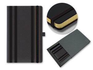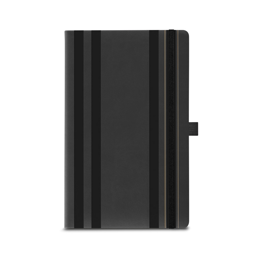 Poznámkový linkovaný zápisník s gumičkou, vlepeným kapsou a poutkem na psací potřeby, 240 stran, velikost A5. Zápisník má zlaté okraje stránek.
