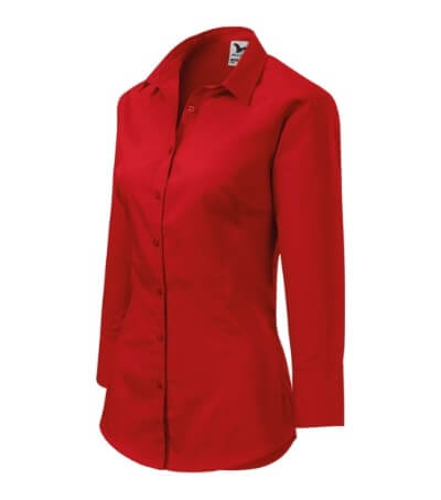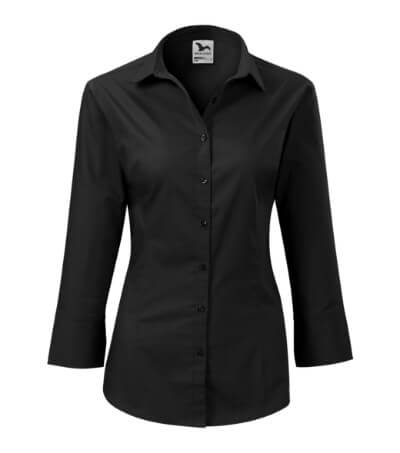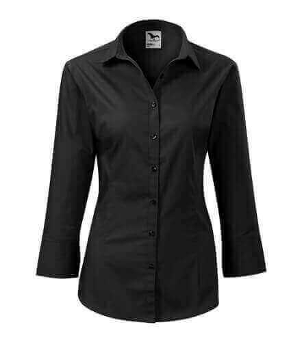 Kvalitní dámská halenka s 3/4 rukávem z jemného materiálu. Tvarovaná pásovými a prsními záševky zvýrazňujícími dámskou siluetu. Dvoudílný košilový límec. Přední okraje začištěny légou. Zapínání na knoflíky až ke krku (s jedním náhradním knoflíkem). Dolní okraje rukávů všité do vyhrnování manžety s ozdobným rozparkem. Tvarovaný dolní okraj. Vhodná pro potisk a výšivku.
