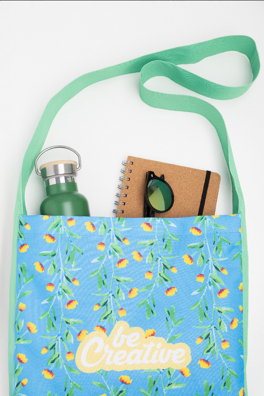 Taška přes rameno vyrobeno na zakázku z 600D RPET polyesteru s dlouhým ramenním popruhem a zapínáním na knoflík. S celoplošným sublimačním potiskem a výrazným RPET štítkem. Cena nezahrnuje tiskovou přípravu. Min. min.: 25 ks. Be Creative. Nosnost tašky: 5 kg. Objem tašky: 15.75 l