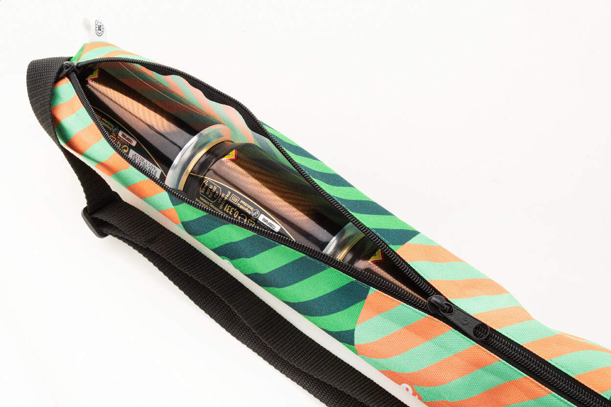 Taška na plechovky vyrobená na míru z polyesteru 600D RPET s přihrádkou na zip a nastavitelným ramenním popruhem. S celoplošným sublimačním potiskem a výraznou RPET etiketou. Vhodná pro 5 ks standardních hliníkových plechovek o objemu 0,33 l. Minimální objednávka: 25 ks.