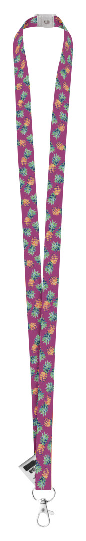 Polyesterový lanyard 15 mm RPET na zakázku s kovovou karabinkou a bezpečnostní přezkou z pšeničné slámy, se sublimačním potiskem na obou stranách.
