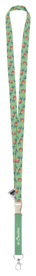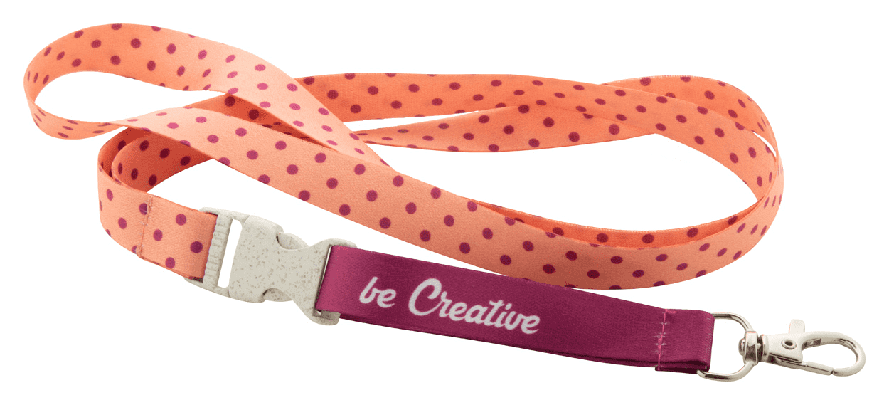 Polyesterový lanyard 15 mm RPET na zakázku s oddělitelnou kovovou karabinkou a bezpečnostní přezkou z pšeničné slámy, se sublimačním potiskem na obou stranách.