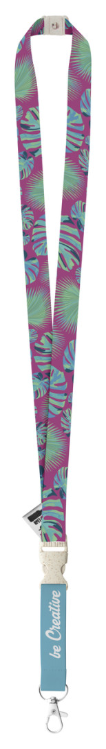 Polyesterový lanyard RPET na zakázku s oddělitelnou kovovou karabinkou a bezpečnostní přezkou z pšeničné slámy, se sublimačním potiskem na obou stranách.