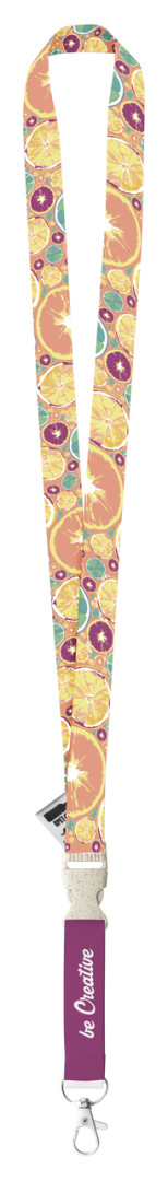 Polyesterový lanyard RPET na zakázku s oddělitelnou kovovou karabinkou a bezpečnostní přezkou z pšeničné slámy, se sublimačním potiskem na obou stranách.