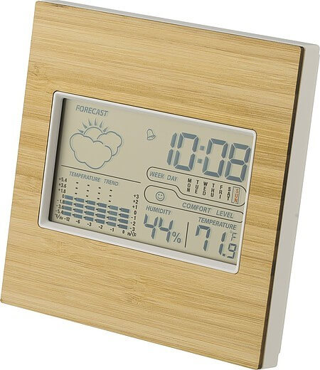 Meteostanice z bambusu, ABS a skla se skládacím stojanem, který lze uzamknout do několika různých poloh. Funkce: čas, kalendář, týdenní přehled, budík a odložení, informace o teplotě, vlhkosti a počasí. Baterie jsou součástí dodávky.