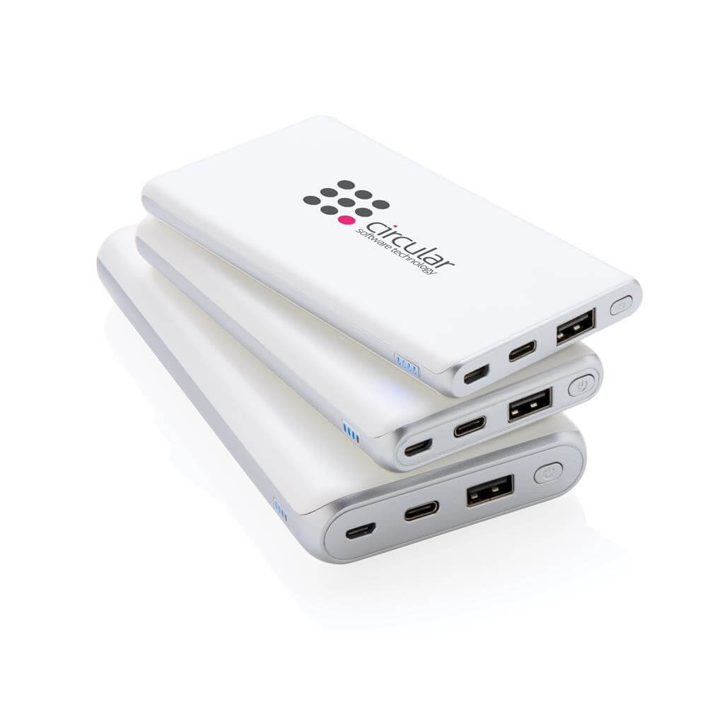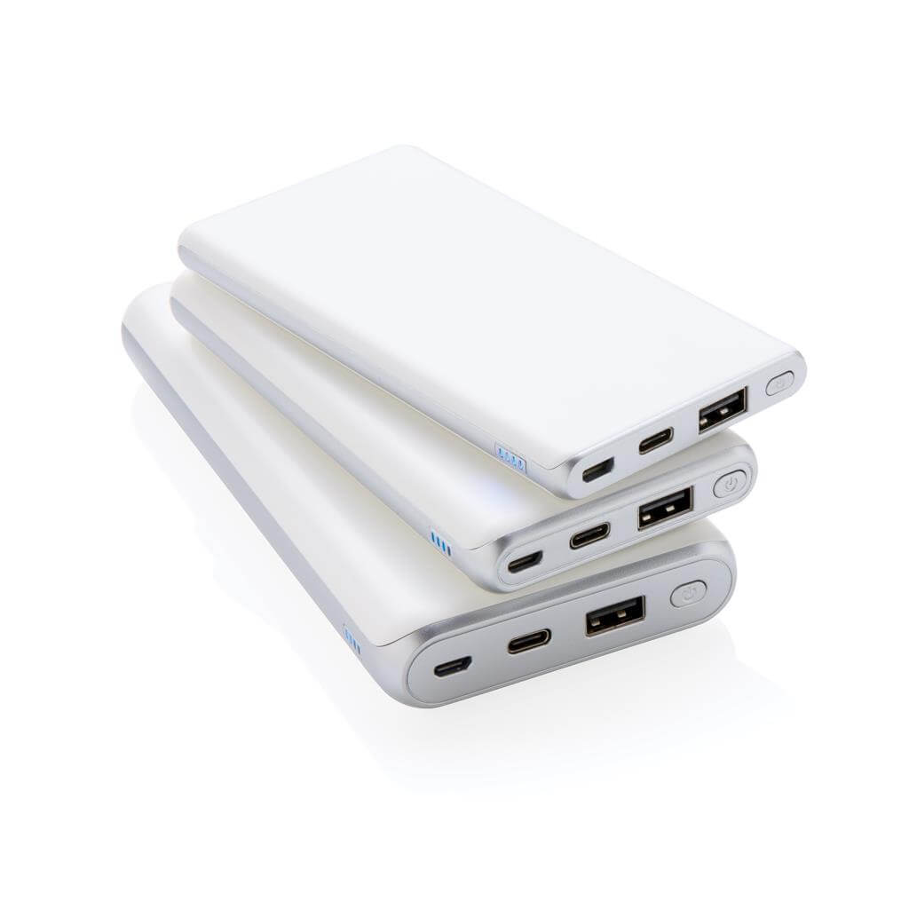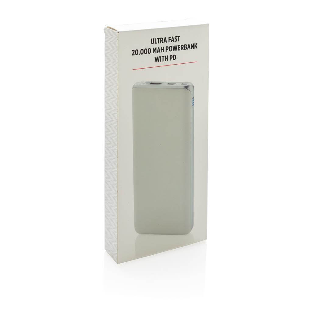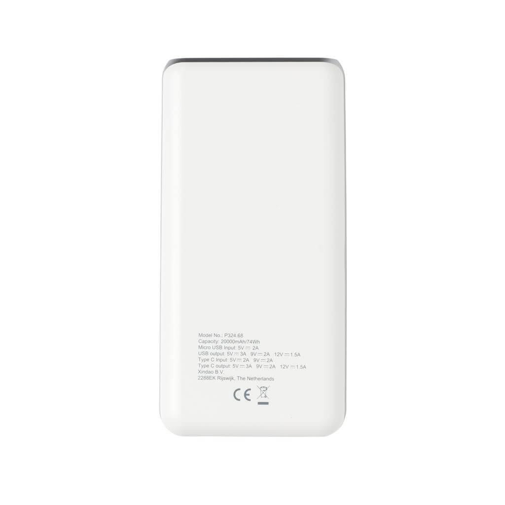 Nabíjejte rychlostí blesku! Powerbanka o kapacitě 20 000 mAh nabízející aktuálně nejrychlejší možnosti nabíjení. S klasickým USB portem a USB typu C, podporující PD (Power Delivery) pro mimořádně rychlé nabíjení vybraných zařízení. Micro USB vstup: 5V/2A. USB výstup: 5V/3A 9V/2A 12V/1.5A. USB Typu C: vstup: 5V/2A 9V/2A, výstup: 5V/3A 9V/2A 12V/1.5A. 2 baterií typu Li-poly súčasťou balenia. PMS color 1: White