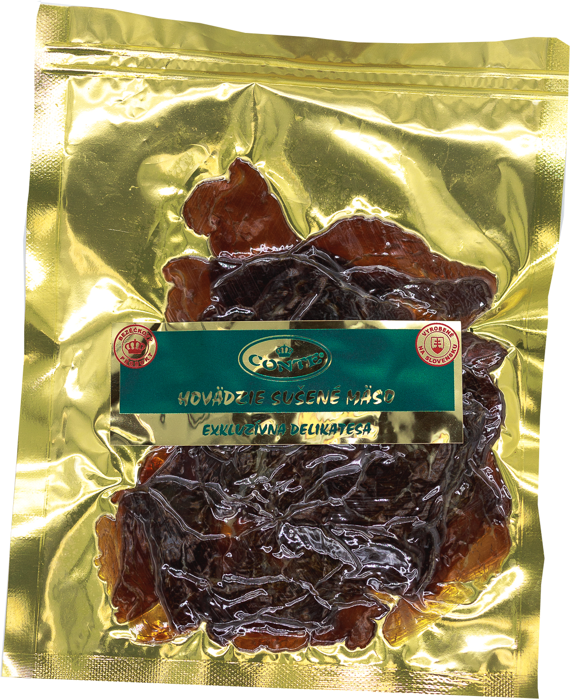 Hovězí sušené maso - lahodná pochoutka vyrobená pouze z hovězího masa a soli. Na výrobu 100 g výrobku se použije 250 g syrového masa. Vakuové balení 40 g.