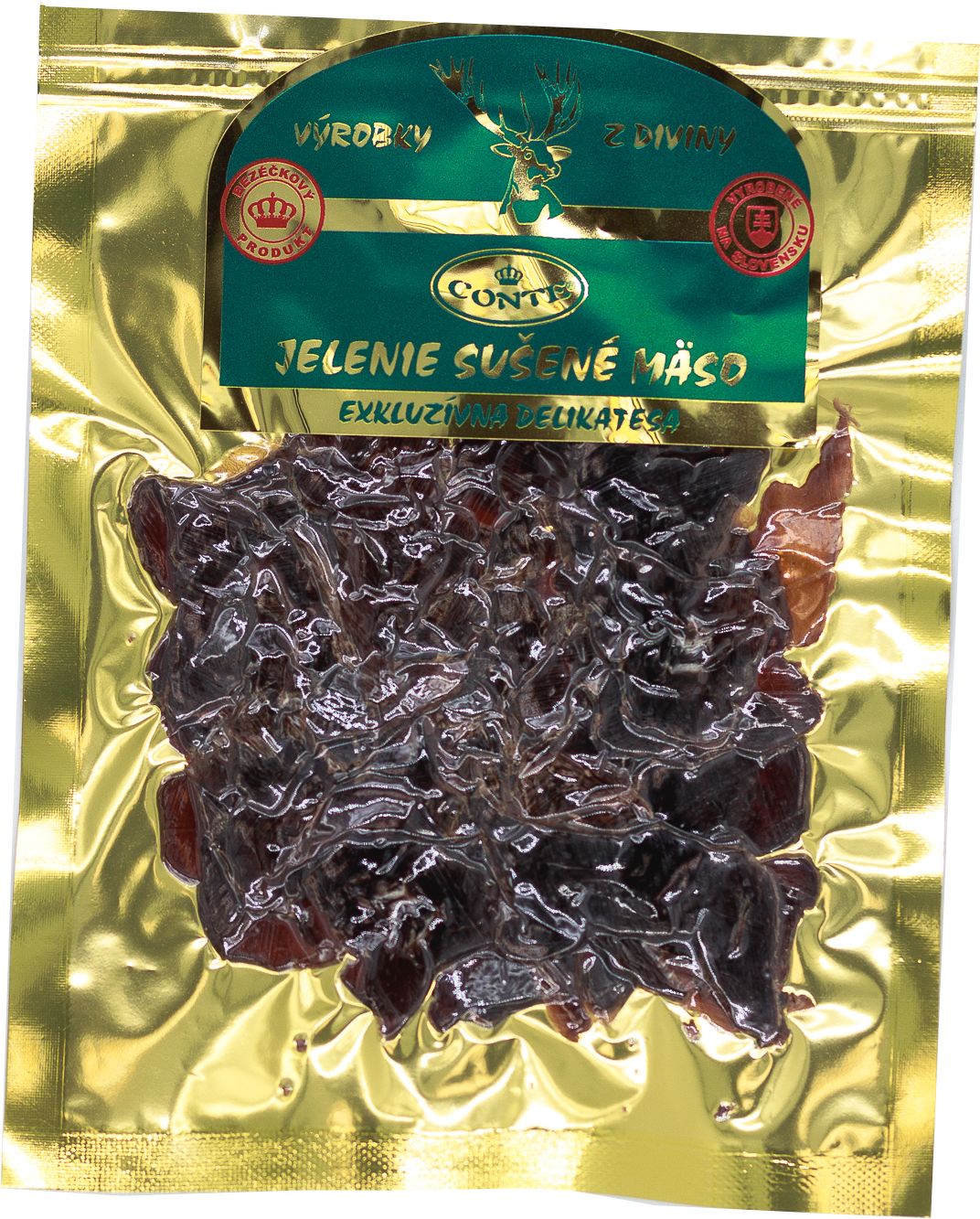 Sušené jelení maso - pochoutka z nejkvalitnějšího masa z volně žijících jelenů, konzervovaného jedlou solí. Vakuové balení, 40 g (±10 %). Na výrobu 100 g výrobku bylo použito 250 g syrového masa. Skladování: při teplotě 0-20 °C, spotřebujte do 48 hodin po otevření. Chraňte před sluncem a mrazem.