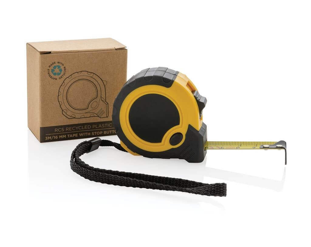 Svinovací metr s délkou 3 m vyrobený z RCS recyklovaného ABS plastu. RCS (Recycled Claim Standard) je globální standard, který umožňuje ověřit použití recyklovaného materiálu v produktu napříč celým dodavatelským řetězcem. Celkový podíl recyklátu dle váhy produktu: 17 %. 16 mm široké žluté pásmo s ocelovým háčkem. TRP pogumovaná úprava pro pohodlný úchop, poutko na zápěstí, tlačítko pro uzamčení/uvolnění, extra tlačítko pro zastavení na straně. Baleno v FSC® kraftové dárkové krabičce.