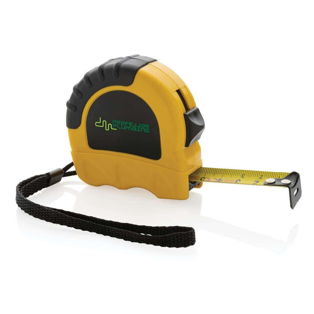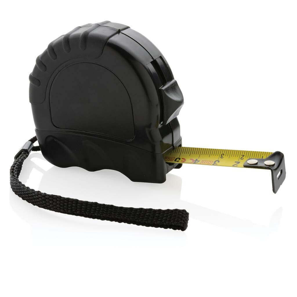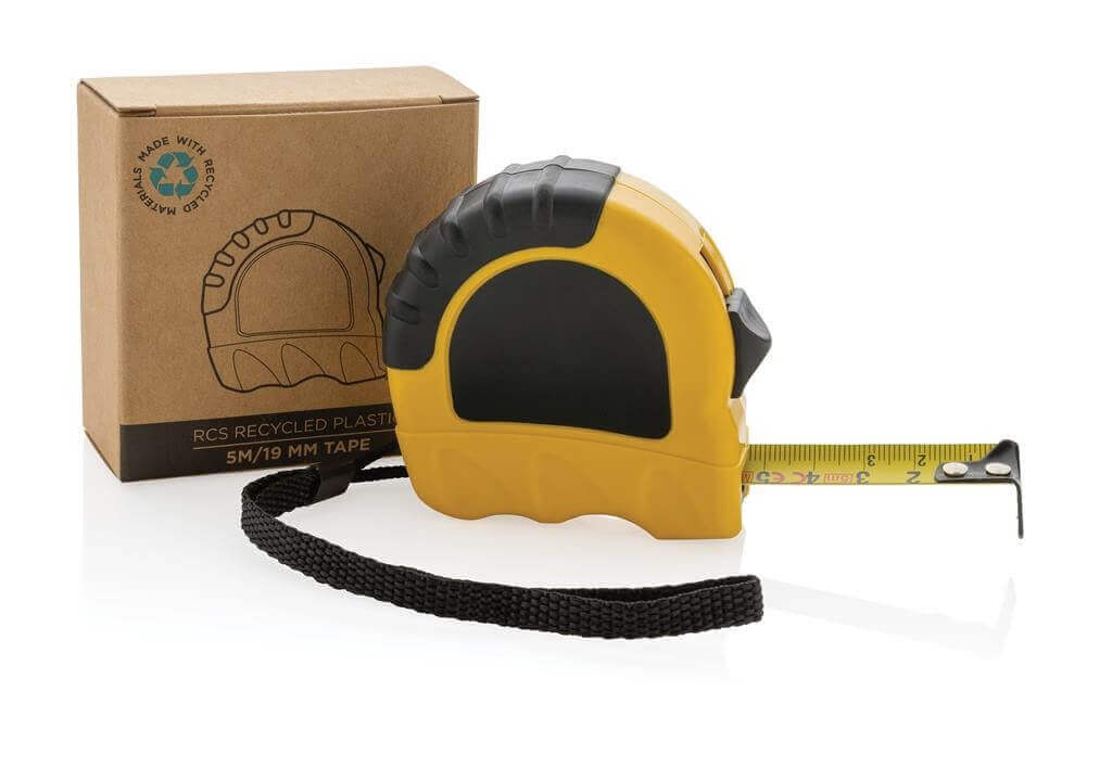Svinovací metr s délkou 5 m vyrobený z RCS recyklovaného ABS plastu. RCS (Recycled Claim Standard) je globální standard, který umožňuje ověřit použití recyklovaného materiálu v produktu napříč celým dodavatelským řetězcem. Celkový podíl recyklátu dle váhy produktu: 17 %. 19 mm široké žluté pásmo s ocelovým háčkem. TRP pogumovaná úprava pro pohodlný úchop, poutko na zápěstí, tlačítko pro uzamčení/uvolnění. Baleno v FSC® kraftové dárkové krabičce.