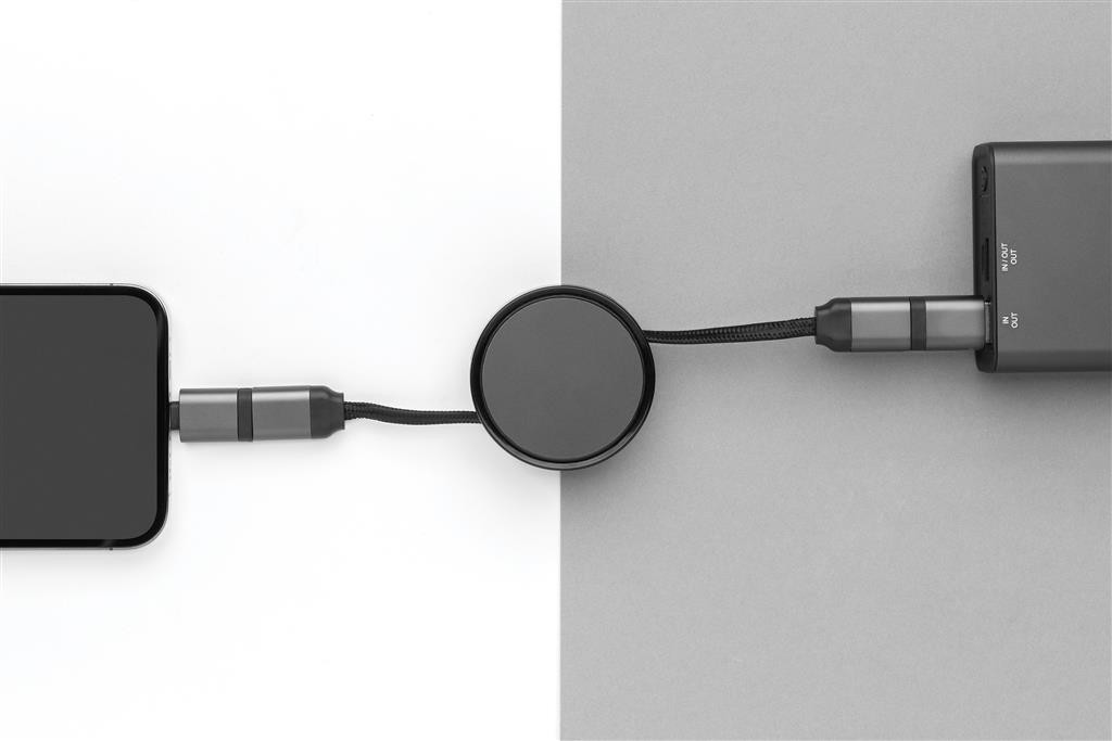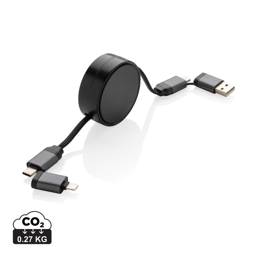 Svinovací nabíjecí kabel 6 v 1 vyrobený z RCS recyklovaného hliníku, TPE a ABS. RCS (Recycled Claim Standard) je globální standard, který umožňuje ověřit použití recyklovaného materiálu v produktu napříč celým dodavatelským řetězcem. Celkový podíl recyklátu dle váhy produktu: 68 %. Hliník při recyklaci neztrácí své vlastnosti, lze tak recyklovat opakovaně. Kabel disponuje 5 konektory: USB C/USB A vstup, USB C/micro USB/iOS výstup. USB C je vhodné pro nabíjení moderních telefonů, ale i notebooků. Kabel s maximální délkou 100cm je opletený RCS recyklovaným PET pro vyšší odolnost. Podporuje přenos dat (pouze USB C-USB C). Podporuje rychlonabíjení až 45W. Baleno v FSC® dárkovém balení.