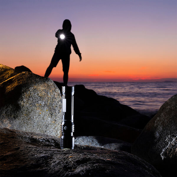 Svítilna s CREE XPG diodami 5 W a svítivostí 250 lm, dosah 200 m, životnost diody 100 000 h, funkce zoom. Obsahuje vysunovací svítilnu se 16 diodami 3 W (svítivost 160 lm). Baleno v pouzdru z nylonu a dárkové krabičce. 4 AAA baterie v ceně.