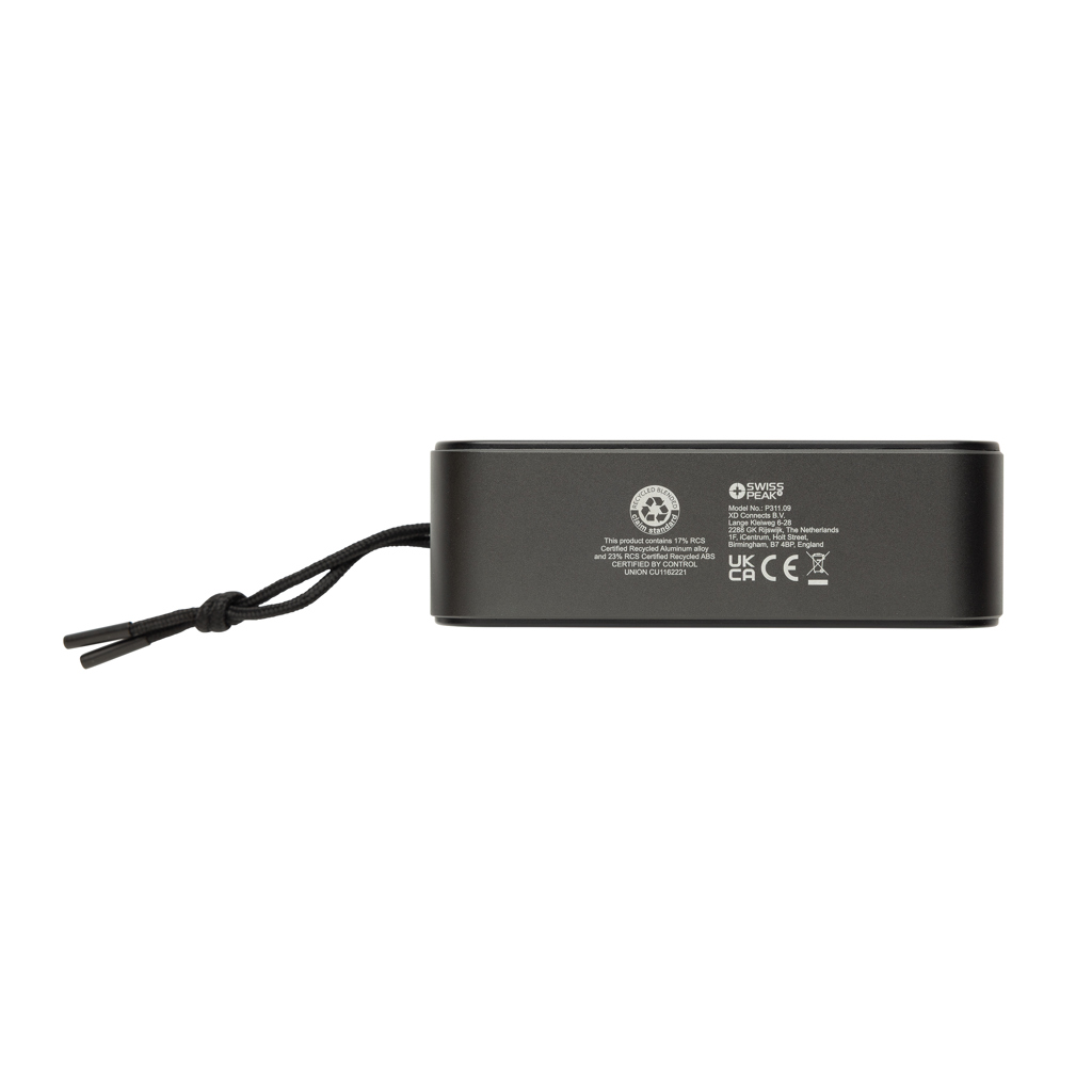 Swiss Peak 10W reproduktor z recyklovaného hliníku RCS přináší výkonný a kvalitní zvuk s hlubokými, rezonančními basy díky integrovanému subwooferu a duálním 10W reproduktorům. Je navržen pro špičkový zvukový výkon, disponuje technologií BT 5.3 pro plynulé připojení a automatické párování se zařízeními. Vestavěná polymerová Li-ion baterie s kapacitou 1200 mAh umožňuje až 5 hodin přehrávání při 50% hlasitosti a plné nabití za 2,5 hodiny pomocí přibaleného USB-C na USB-C kabelu. Mezi další funkce patří USB-C port a AUX vstup. Reproduktor je vyroben z recyklovaného hliníku s certifikací RCS. RCS (Recycled Claim Standard) je standard pro ověření recyklovaného obsahu produktu v rámci celého dodavatelského řetězce. Celkový recyklovaný obsah: 40 % na základě celkové hmotnosti položky. Tento reproduktor neobsahuje PVC a je zabalen v dárkové krabici s certifikátem FSC. Obsahuje také popruh pro přenášení z recyklovaného RPET materiálu.