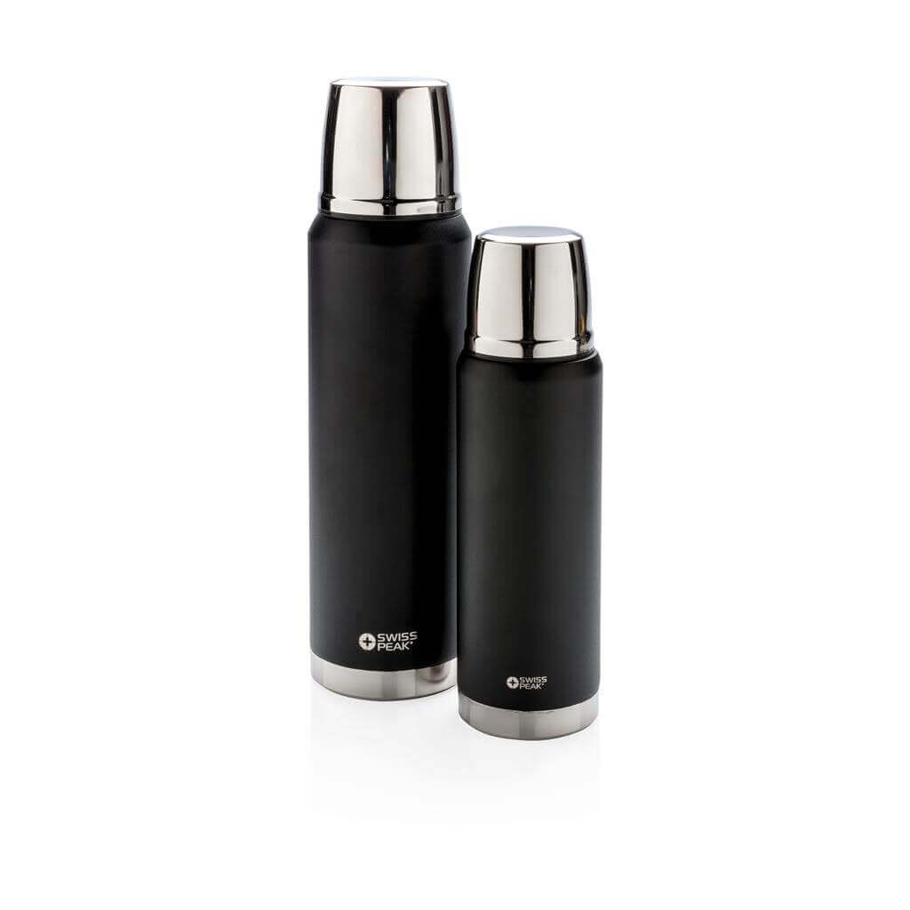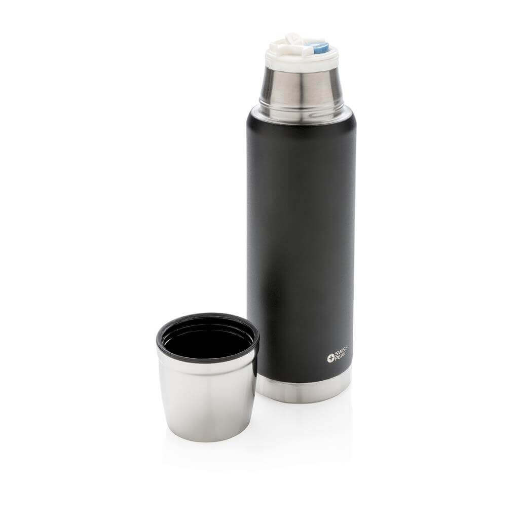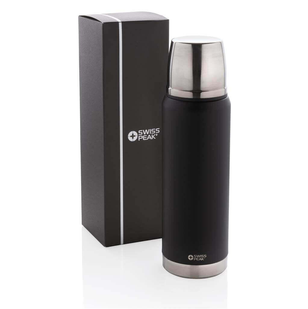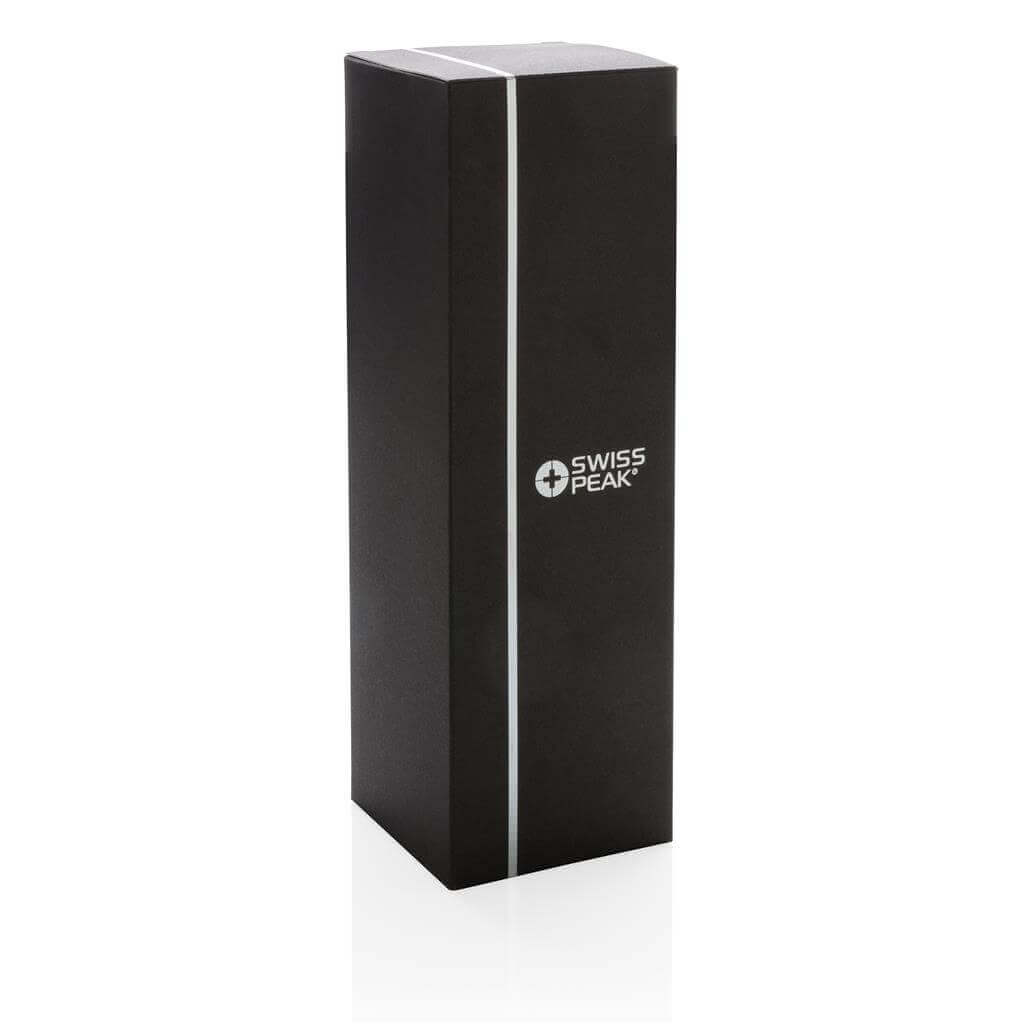 Řada Swiss Peak Elite vyčnívá použitím dvojstěnné vakuovo měděné izolace a nerezavějící oceli 18/8. Kvalitní matný černý nástřik zaručeně vydrží bez vyblednutí či popraskání. Vnitřní stěna je osazena měděnou izolací, díky které vaše nápoje zůstanou horké po dobu až 8 hodin a studené až po 24 hodin. Pouze pro ruční mytí, nepropustná. Objem 500 ml. PMS color 1: Black